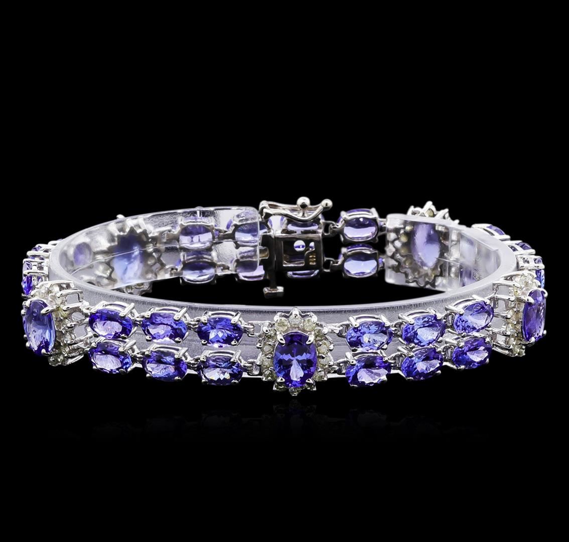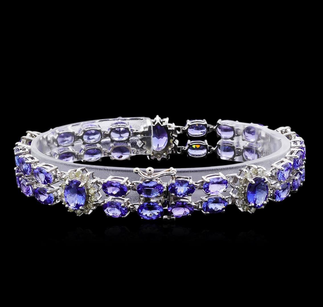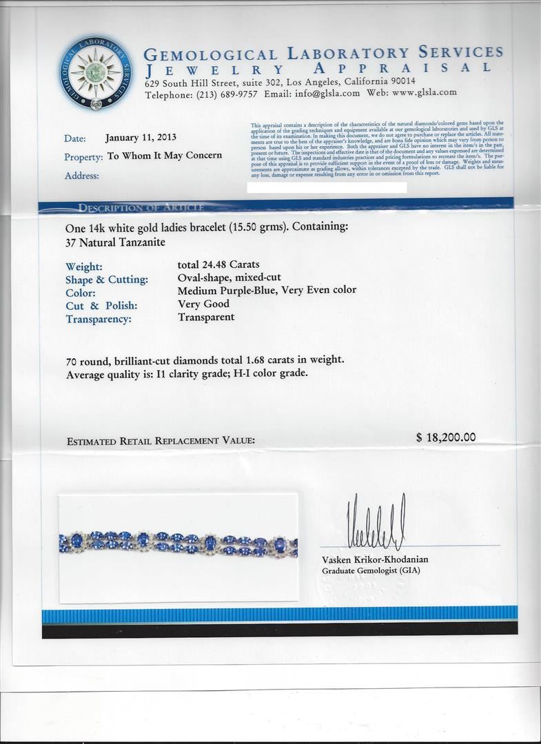One 14KT white gold ladies Michael Christoff bracelet weighing a total of 15.50 grams. Containing: 37 Natural Tanzanites: Weight: Total 24.48ct. Shape & Cutting: Oval-shaped, mixed-cut. Color: Medium purple-blue, very even color. Cut & Polish: Very good. Transparency: Transparent. The tanzanites are complemented by 70 round, brilliant-cut diamonds with a total weight of 1.68ct. Clarity Grade: I1. Color Grade: H - I. GLS Appraised at $18,200.00.