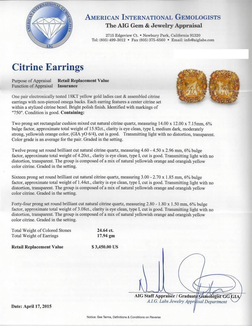 One pair electronically tested 18KT yellow gold ladies cast & assembled citrine earrings with non-pierced omega backs. Each earring features a center citrine set within a stylized citrine bezel. Bright polish finish. Identified with markings of "750". Condition is good. Containing: Two prong set rectangular cushion mixed cut natural citrine quartz, measuring 14.00 x 12.00 x 7.15mm, 6% bulge factor, approximate total weight of 15.92ct., clarity is eye clean, type I, medium dark, moderately strong, yellowish orange color, (GIA yO 6/4), cut is good. Transmitting light with no distortion, transparent. Color grade is an average for the pair. Graded in the setting. Twelve prong set round brilliant cut natural citrine quartz, measuring 4.60 - 4.50 x 2.96 mm, 6% bulge factor, approximate total weight of 4.20ct., clarity is eye clean, type I, cut is good. Transmitting light with no distortion, transparent. The group is composed of a mix of natural yellowish orange and orangish yellow color citrine. Graded in the setting. Sixteen prong set round brilliant cut natural citrine quartz, measuring 3.00 - 2.70 x 1.85 mm, 6% bulge factor, approximate total weight of 1.44ct., clarity is eye clean, type I, cut is good. Transmitting light with no distortion, transparent. The group is composed of a mix of natural yellowish orange and orangish yellow color citrine. Graded in the setting. Forty-four prong set round brilliant cut natural citrine quartz, measuring 2.80 - 1.80 x 1.50 mm, 6% bulge factor, approximate total weight of 3.08ct., clarity is eye clean, type I, cut is good. Transmitting light with no distortion, transparent. The group is composed of a mix of natural yellowish orange and orangish yellow color citrine. Graded in the setting. Total Weight of Colored Stones: 24.64 ct. Total Weight of Earrings: 17.94 gm. AIG Appraised at $3,450.00.