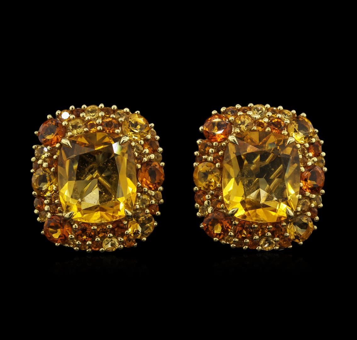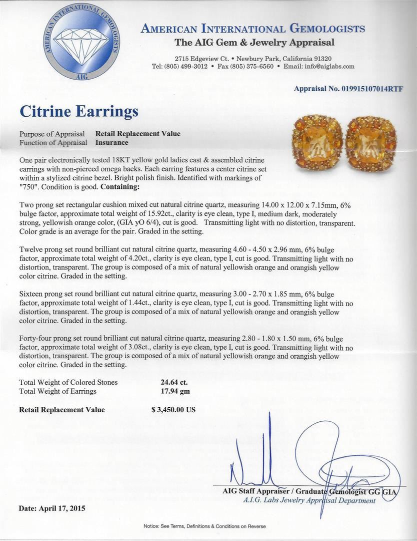 One pair electronically tested 18KT yellow gold ladies cast & assembled citrine earrings with non-pierced omega backs. Each earring features a center citrine set within a stylized citrine bezel. Bright polish finish. Identified with markings of "750". Condition is good. Containing: Two prong set rectangular cushion mixed cut natural citrine quartz, measuring 14.00 x 12.00 x 7.15mm, 6% bulge factor, approximate total weight of 15.92ct., clarity is eye clean, type I, medium dark, moderately strong, yellowish orange color, (GIA yO 6/4), cut is good. Transmitting light with no distortion, transparent. Color grade is an average for the pair. Graded in the setting. Twelve prong set round brilliant cut natural citrine quartz, measuring 4.60 - 4.50 x 2.96 mm, 6% bulge factor, approximate total weight of 4.20ct., clarity is eye clean, type I, cut is good. Transmitting light with no distortion, transparent. The group is composed of a mix of natural yellowish orange and orangish yellow color citrine. Graded in the setting. Sixteen prong set round brilliant cut natural citrine quartz, measuring 3.00 - 2.70 x 1.85 mm, 6% bulge factor, approximate total weight of 1.44ct., clarity is eye clean, type I, cut is good. Transmitting light with no distortion, transparent. The group is composed of a mix of natural yellowish orange and orangish yellow color citrine. Graded in the setting. Forty-four prong set round brilliant cut natural citrine quartz, measuring 2.80 - 1.80 x 1.50 mm, 6% bulge factor, approximate total weight of 3.08ct., clarity is eye clean, type I, cut is good. Transmitting light with no distortion, transparent. The group is composed of a mix of natural yellowish orange and orangish yellow color citrine. Graded in the setting. Total Weight of Colored Stones: 24.64 ct. Total Weight of Earrings: 17.94 gm. AIG Appraised at $3,450.00.