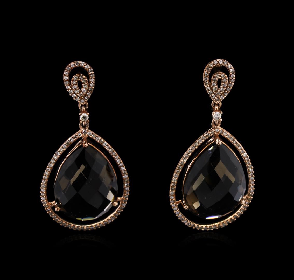 One pair electronically tested 14KT rose gold ladies cast & assembled smoky quartz and diamond dangle earrings with 14KT yellow gold standard backs. Bright polish finish. Identified with markings of "14K". Condition is new, good workmanship. Containing: Two prong set pear mixed cut natural smoky quartz's, measuring 19.80 x 15.00 x 7.50mm, 6%. bulge factor, approximate total weight of 25.12ct., clarity is eye clean, medium dark, very slightly grayish, brown color, (GIA Br 6/3), cut is good. Transmitting light with no distortion, transparent. Measurements & the color grade are an average for the pair. Graded in the setting. Two prong set round brilliant cut diamonds, measuring 2.00 - 2.00 x 1.20mm (depth est.) approximate total weight of 2 Stones = 0.06ct. Graded in the setting. Clarity: VS-2. Color: I One Hundred Eighty prong set single cut diamonds, measuring 1.00 - 0.90 x 0.57mm (depth est.) approximate total weight of 180 Stones = 0.65ct. Graded in the setting. Clarity: SI-1 to I-1. Color: H - J. Total Weight of Colored Stones 25.12ct. Total Weight of Diamonds 0.71ct. Total Weight of Earrings 12.02gm. AIG Appraised at $4,145.00.