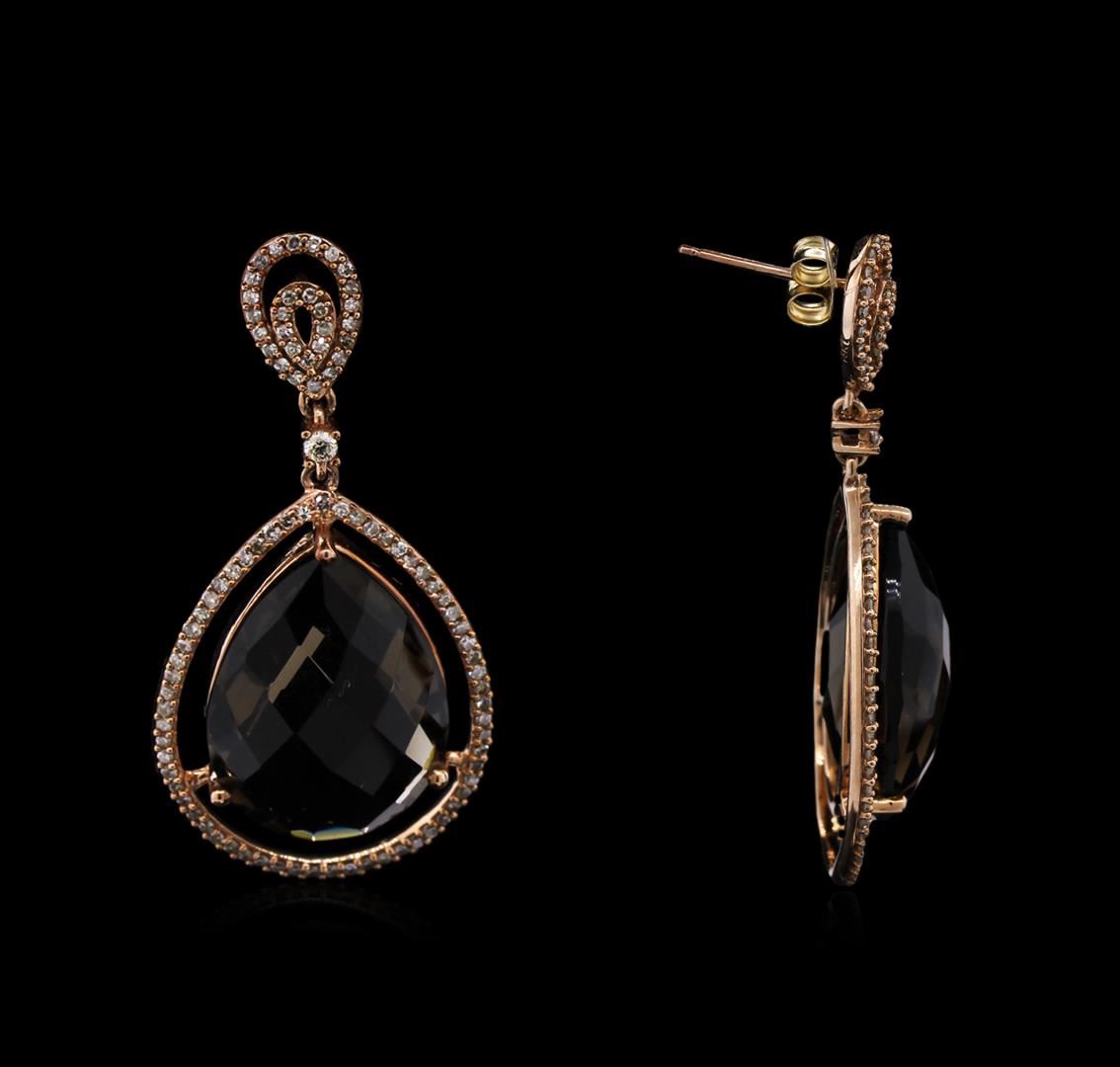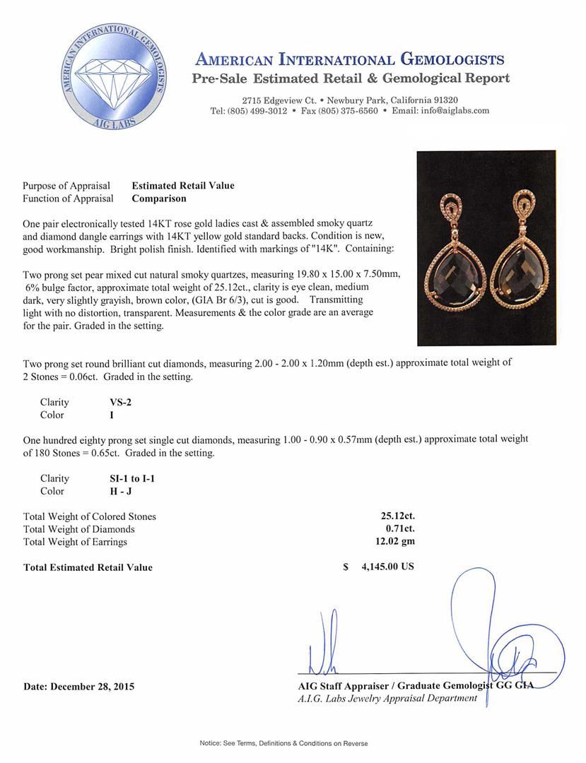 One pair electronically tested 14KT rose gold ladies cast & assembled smoky quartz and diamond dangle earrings with 14KT yellow gold standard backs. Bright polish finish. Identified with markings of "14K". Condition is new, good workmanship. Containing: Two prong set pear mixed cut natural smoky quartz's, measuring 19.80 x 15.00 x 7.50mm, 6%. bulge factor, approximate total weight of 25.12ct., clarity is eye clean, medium dark, very slightly grayish, brown color, (GIA Br 6/3), cut is good. Transmitting light with no distortion, transparent. Measurements & the color grade are an average for the pair. Graded in the setting. Two prong set round brilliant cut diamonds, measuring 2.00 - 2.00 x 1.20mm (depth est.) approximate total weight of 2 Stones = 0.06ct. Graded in the setting. Clarity: VS-2. Color: I One Hundred Eighty prong set single cut diamonds, measuring 1.00 - 0.90 x 0.57mm (depth est.) approximate total weight of 180 Stones = 0.65ct. Graded in the setting. Clarity: SI-1 to I-1. Color: H - J. Total Weight of Colored Stones 25.12ct. Total Weight of Diamonds 0.71ct. Total Weight of Earrings 12.02gm. AIG Appraised at $4,145.00.