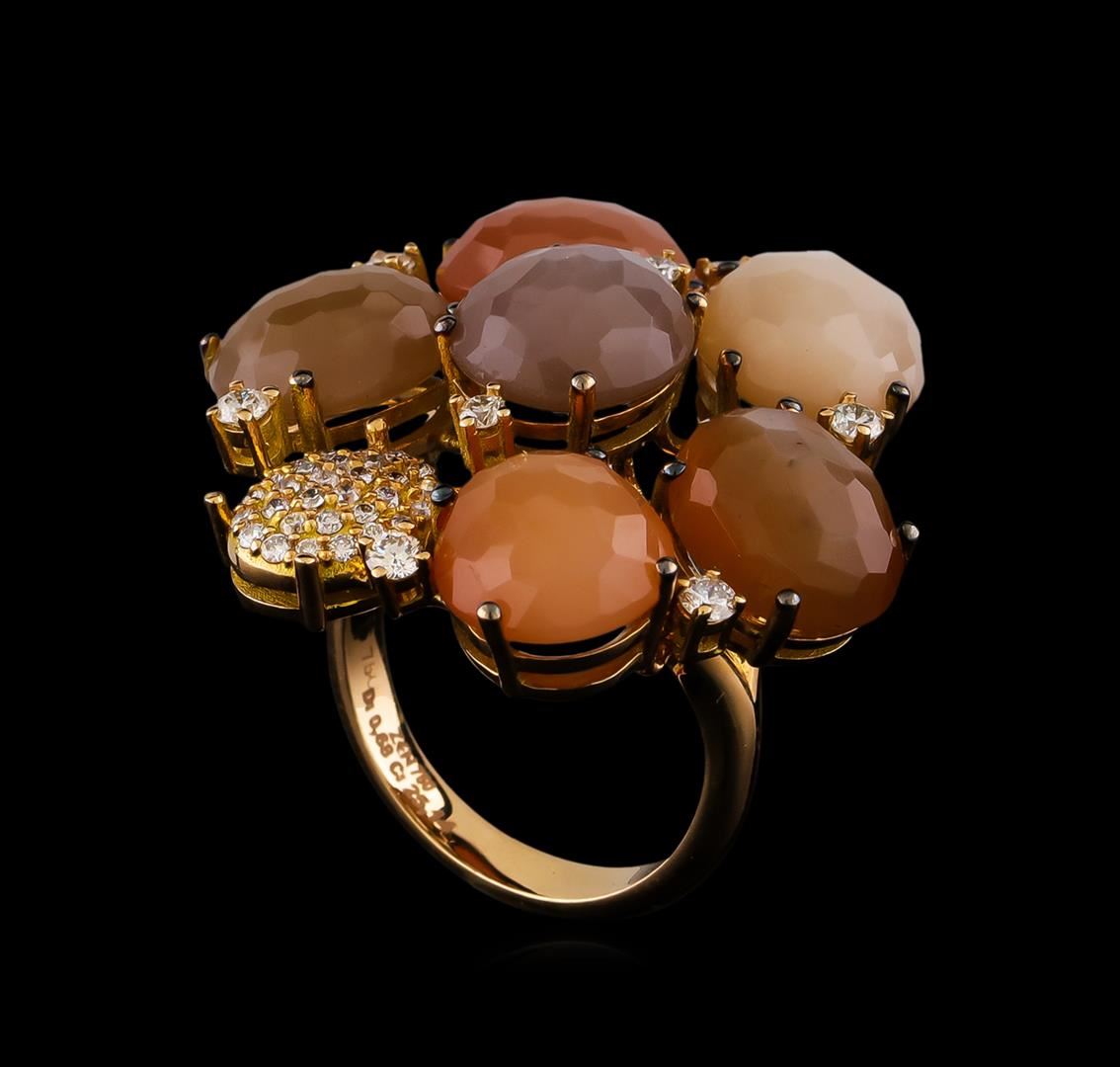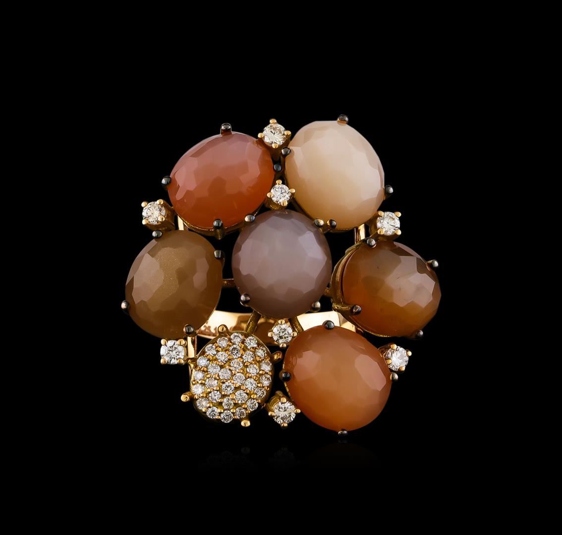 One electronically tested 18KT yellow gold ladies cast & assembled multi color sunstone and diamond ring with a bright and anodized finish. The ring features a stylized multi color sunstone cluster supported by diamond accents, completed by a three millimeter wide band. Trademark is ZEN. Identified with markings of "750". Condition is new, good workmanship. Containing: Six prong set oval cabochon cut natural multi color sunstones, measuring 11.00 x 9.00 x 6.00mm, approximate total weight of 25.14ct., clarity is heavily included, cut is good. Transmitting light somewhat diffusely, translucent. Naturally occurring internal & external characteristics are present. Measurements are an average for the group. The group is composed of a mix of natural red, orangy red, orange and yellowish orange color sunstone. Graded in the setting. Eight prong set round brilliant cut diamonds, measuring 2.40 - 2.20 x 1.38mm (depth est.) approximate total weight of 8 Stones = 0.45ct. Graded in the setting. Clarity: SI-1 to SI-2. Color: G - H Thirty prong set round brilliant cut diamonds, measuring 1.20 - 1.10 x 0.69mm (depth est.) approximate total weight of 30 Stones = 0.23ct. Graded in the setting. Clarity: SI-1 to SI-2. Color: G - H. Total Weight of Colored Stones 25.14ct. Total Weight of Diamonds 0.68ct. Total Weight of Ring 16.77gm. AIG Appraised at $5,435.00.