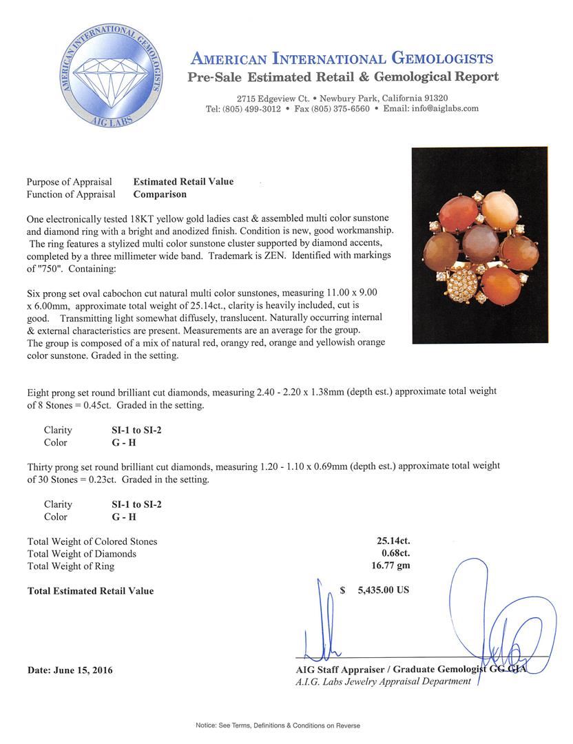 One electronically tested 18KT yellow gold ladies cast & assembled multi color sunstone and diamond ring with a bright and anodized finish. The ring features a stylized multi color sunstone cluster supported by diamond accents, completed by a three millimeter wide band. Trademark is ZEN. Identified with markings of "750". Condition is new, good workmanship. Containing: Six prong set oval cabochon cut natural multi color sunstones, measuring 11.00 x 9.00 x 6.00mm, approximate total weight of 25.14ct., clarity is heavily included, cut is good. Transmitting light somewhat diffusely, translucent. Naturally occurring internal & external characteristics are present. Measurements are an average for the group. The group is composed of a mix of natural red, orangy red, orange and yellowish orange color sunstone. Graded in the setting. Eight prong set round brilliant cut diamonds, measuring 2.40 - 2.20 x 1.38mm (depth est.) approximate total weight of 8 Stones = 0.45ct. Graded in the setting. Clarity: SI-1 to SI-2. Color: G - H Thirty prong set round brilliant cut diamonds, measuring 1.20 - 1.10 x 0.69mm (depth est.) approximate total weight of 30 Stones = 0.23ct. Graded in the setting. Clarity: SI-1 to SI-2. Color: G - H. Total Weight of Colored Stones 25.14ct. Total Weight of Diamonds 0.68ct. Total Weight of Ring 16.77gm. AIG Appraised at $5,435.00.