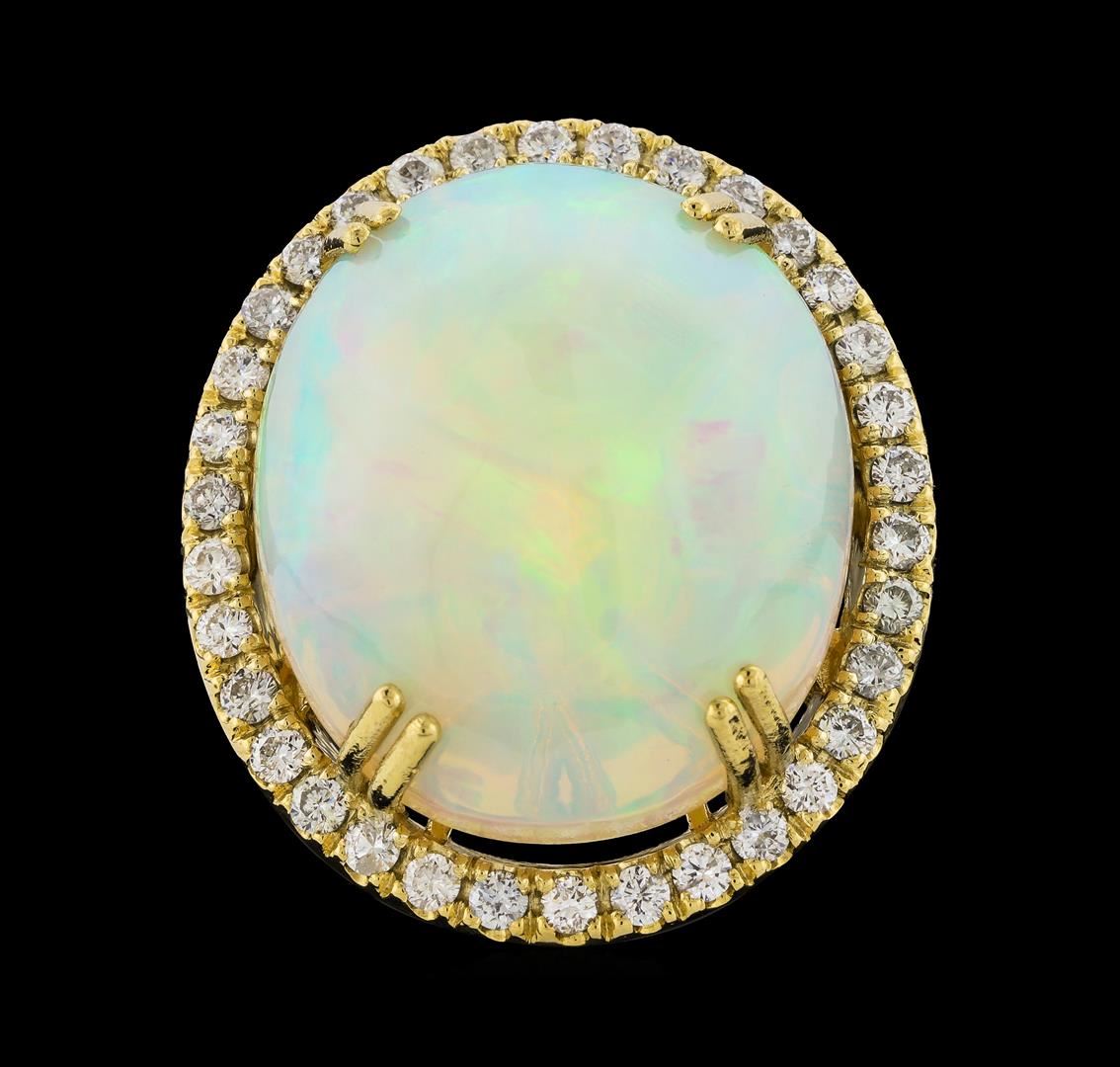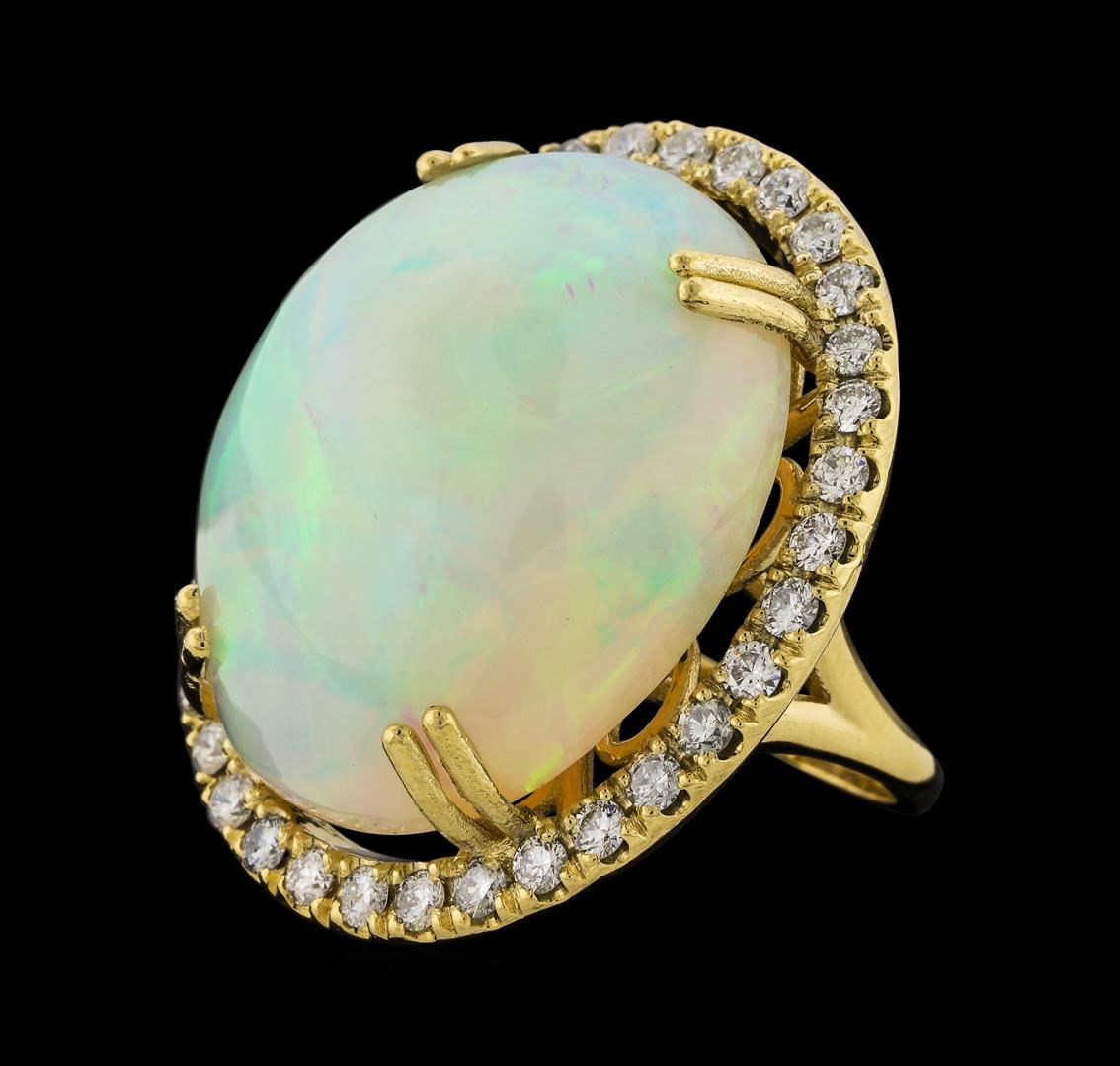 One electronically tested 14KT yellow gold lady's cast fashion ring with a halo with a bright polish finish. The featured lady's ring has a shank measuring 2.00 millimeters wide. Identified with markings of '14K'. Condition is new, good workmanship. Containing: One crystal opal that is cut in a oval shaped cabochon and is prong set, measuring 26.40 mm long x 22.58 mm wide, and 11.75 mm thick and the approximate weight is 25.20 carats. The opal has a very bright, multicolor play of color (fire) in a rolling flashfire pattern; a high dome; a good cut; no inclusions; consistent in its brightness and pattern; and is not directional. Graded in the setting. Thirty-Four prong set round brilliant cut diamonds, measuring 2.30 - 2.20 x 1.40mm (depth est.) approximate total weight of 34 Stones = 1.48ct. Graded in the setting. Clarity SI-1 to SI-2. Color: G - I Cut Good. Total Weight of Diamonds 1.48ct.. Total Weight of Opals 25.20ct.. Total Weight of Ring 16.40gm. GAS Appraised at $12,140.00.