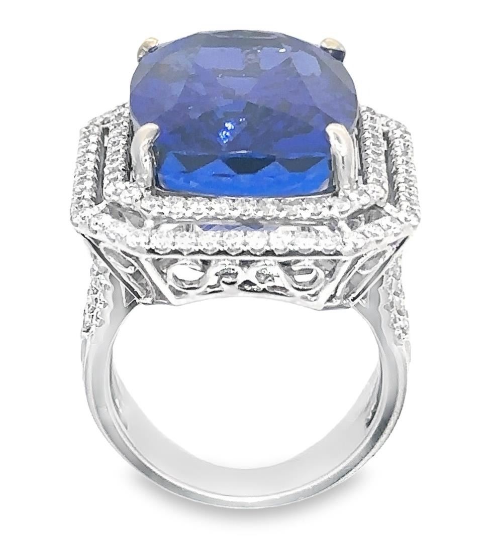 One electronically tested 14KT white gold lady's cast fashion emerald basket double halo ring with a cathedral shank with a bright polish finish. The featured lady's ring has a shank measuring 3.90 millimeters. Identified with markings of "14K". Condition is new, good workmanship. Containing: One prong set rectangular cushion modified mixed cut natural tanzanite, measuring 18.40 x 14.25 x 11.51mm, (depth est.) 8% bulge factor, approximate weight of 25.18ct., clarity is eye clean, medium dark, strong, bluish violet color, (GIA bV 6/5), cut is excellent. Transmitting light with no distortion, transparent. Colored gemstones are presumed to have been subjected to commonly used enhancement processes. Graded in the setting. One Hundred Forty-Eight prong set round brilliant cut diamonds, measuring 1.50 - 1.40 x 0.88mm (depth est.) approximate total weight of 148 Stones = 1.66ct. Graded in the setting. Color G - I Clarity SI-1 to SI-2 Cut Very Good Total Weight of Colored Stones 25.18ct. Total Weight of Diamonds 1.66ct. Total Weight of Ring 14.10gm Estimated Retail Value $ 48500.00