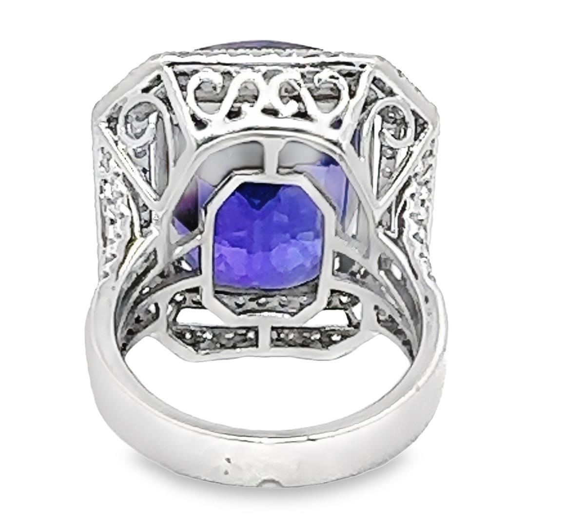 One electronically tested 14KT white gold lady's cast fashion emerald basket double halo ring with a cathedral shank with a bright polish finish. The featured lady's ring has a shank measuring 3.90 millimeters. Identified with markings of "14K". Condition is new, good workmanship. Containing: One prong set rectangular cushion modified mixed cut natural tanzanite, measuring 18.40 x 14.25 x 11.51mm, (depth est.) 8% bulge factor, approximate weight of 25.18ct., clarity is eye clean, medium dark, strong, bluish violet color, (GIA bV 6/5), cut is excellent. Transmitting light with no distortion, transparent. Colored gemstones are presumed to have been subjected to commonly used enhancement processes. Graded in the setting. One Hundred Forty-Eight prong set round brilliant cut diamonds, measuring 1.50 - 1.40 x 0.88mm (depth est.) approximate total weight of 148 Stones = 1.66ct. Graded in the setting. Color G - I Clarity SI-1 to SI-2 Cut Very Good Total Weight of Colored Stones 25.18ct. Total Weight of Diamonds 1.66ct. Total Weight of Ring 14.10gm Estimated Retail Value $ 48500.00