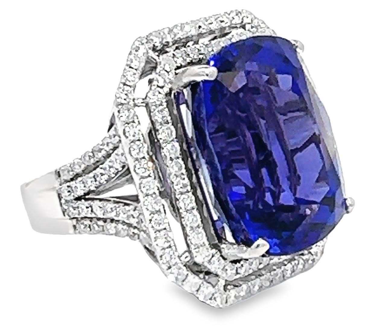 One electronically tested 14KT white gold lady's cast fashion emerald basket double halo ring with a cathedral shank with a bright polish finish. The featured lady's ring has a shank measuring 3.90 millimeters. Identified with markings of "14K". Condition is new, good workmanship. Containing: One prong set rectangular cushion modified mixed cut natural tanzanite, measuring 18.40 x 14.25 x 11.51mm, (depth est.) 8% bulge factor, approximate weight of 25.18ct., clarity is eye clean, medium dark, strong, bluish violet color, (GIA bV 6/5), cut is excellent. Transmitting light with no distortion, transparent. Colored gemstones are presumed to have been subjected to commonly used enhancement processes. Graded in the setting. One Hundred Forty-Eight prong set round brilliant cut diamonds, measuring 1.50 - 1.40 x 0.88mm (depth est.) approximate total weight of 148 Stones = 1.66ct. Graded in the setting. Color G - I Clarity SI-1 to SI-2 Cut Very Good Total Weight of Colored Stones 25.18ct. Total Weight of Diamonds 1.66ct. Total Weight of Ring 14.10gm Estimated Retail Value $ 48500.00