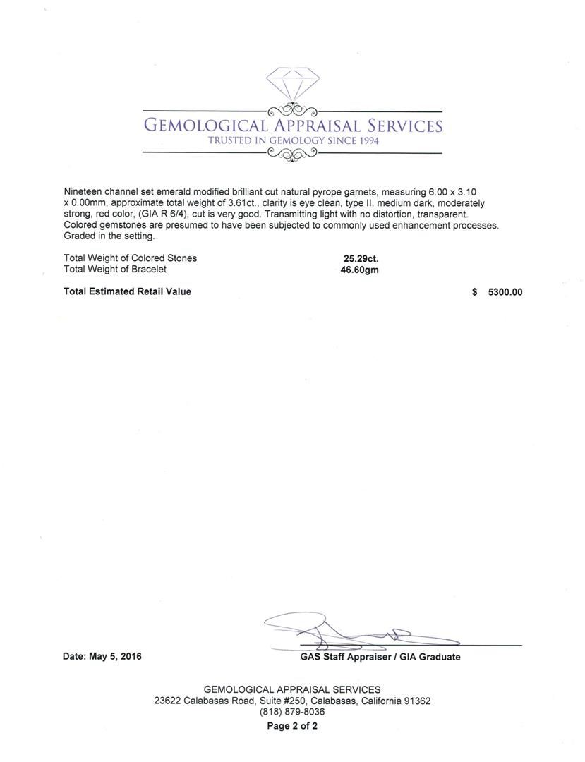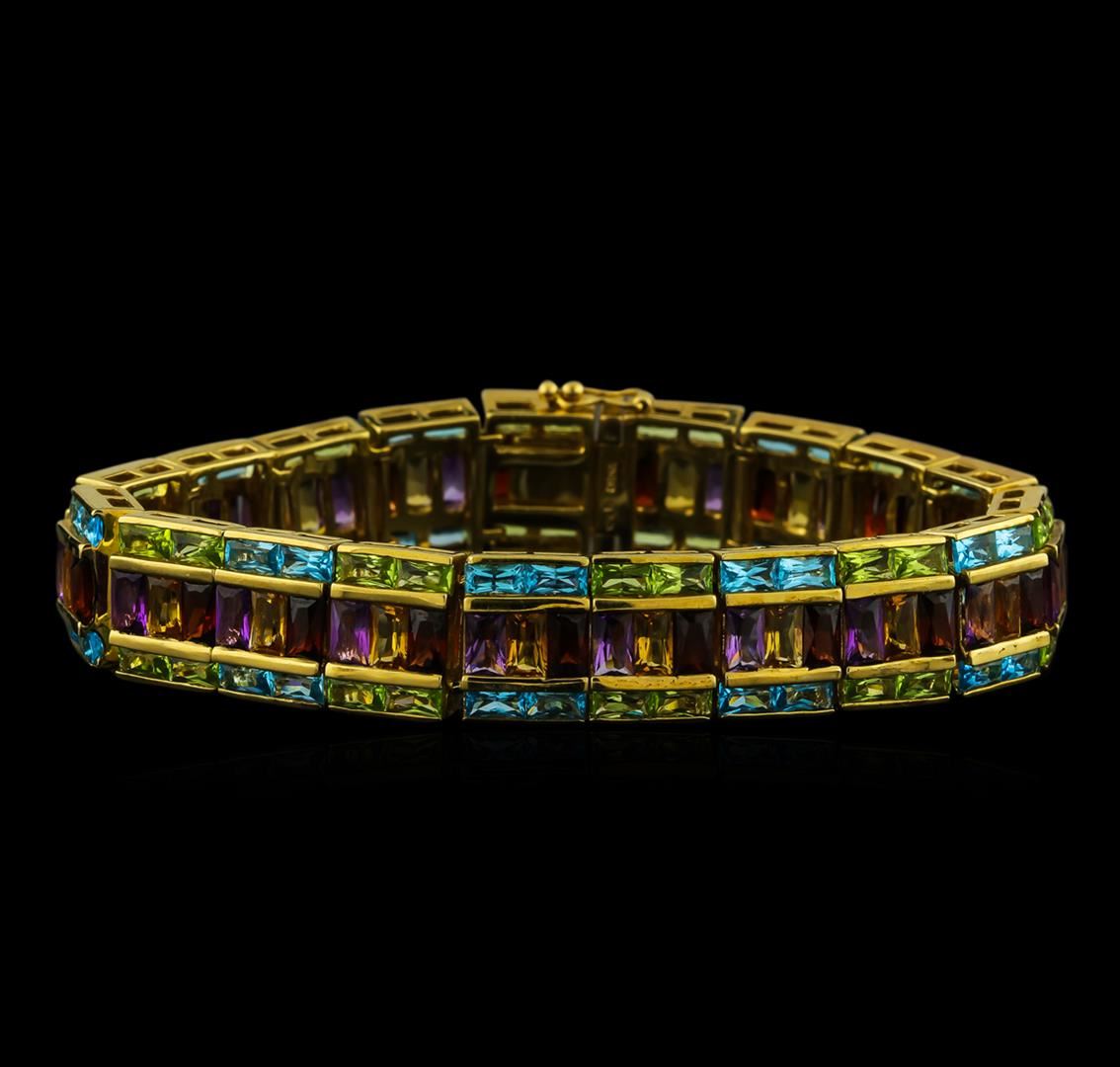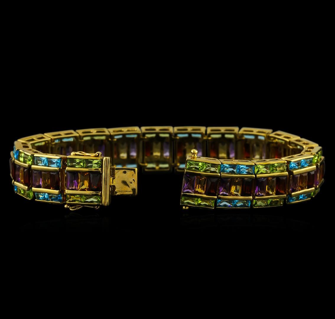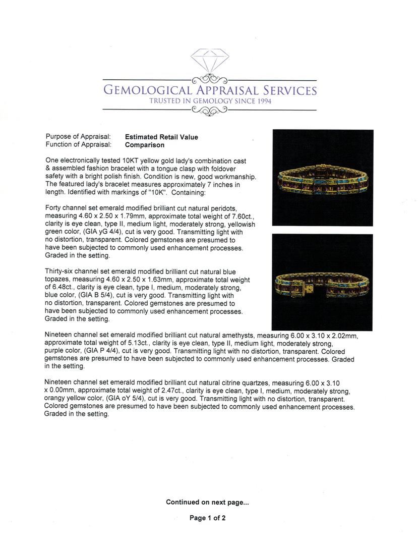 One electronically tested 10KT yellow gold lady's combination cast & assembled fashion bracelet with a tongue clasp with foldover safety with a bright polish finish. The featured lady's bracelet measures approximately 7 inches in length. Identified with markings of "10K". Condition is new, good workmanship. Containing: Forty channel set emerald modified brilliant cut natural peridots, measuring 4.60 x 2.50 x 1.79mm, approximate total weight of 7.60ct., clarity is eye clean, type II, medium light, moderately strong, yellowish green color, (GIA yG 4/4), cut is very good. Transmitting light with no distortion, transparent. Colored gemstones are presumed to have been subjected to commonly used enhancement processes. Graded in the setting. Thirty-six channel set emerald modified brilliant cut natural blue topazes, measuring 4.60 x 2.50 x 1.63mm, approximate total weight of 6.48ct., clarity is eye clean, type I, medium, moderately strong, blue color, (GIA B 5/4), cut is very good. Transmitting light with no distortion, transparent. Colored gemstones are presumed to have been subjected to commonly used enhancement processes. Graded in the setting. Nineteen channel set emerald modified brilliant cut natural amethysts, measuring 6.00 x 3.10 x 2.02mm, approximate total weight of 5.13ct., clarity is eye clean, type II, medium light, moderately strong, purple color, (GIA P 4/4), cut is very good. Transmitting light with no distortion, transparent. Colored gemstones are presumed to have been subjected to commonly used enhancement processes. Graded in the setting. Nineteen channel set emerald modified brilliant cut natural citrine quartzes, measuring 6.00 x 3.10 x 0.00mm, approximate total weight of 2.47ct., clarity is eye clean, type I, medium, moderately strong, orangy yellow color, (GIA oY 5/4), cut is very good. Transmitting light with no distortion, transparent. Colored gemstones are presumed to have been subjected to commonly used enhancement processes. Graded in the setting. Nineteen channel set emerald modified brilliant cut natural pyrope garnets, measuring 6.00 x 3.10 x 0.00mm, approximate total weight of 3.61ct., clarity is eye clean, type II, medium dark, moderately strong, red color, (GIA R 6/4), cut is very good. Transmitting light with no distortion, transparent. Colored gemstones are presumed to have been subjected to commonly used enhancement processes. Graded in the setting. Total Weight of Colored Stones 25.29ct. Total Weight of Bracelet 46.60gm GAS Appraised at $5,300.00.