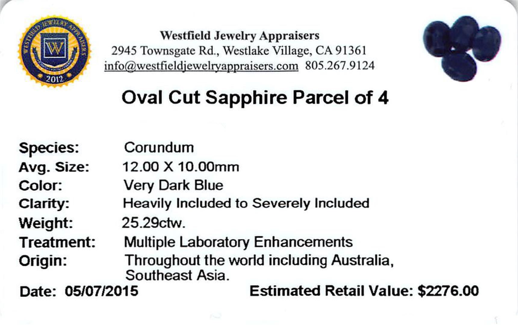 Four oval cut sapphires, measuring 12.00 x 10.00mm, approximate total weight of 25.29ct., clarity is heavily included to severely included, very dark blue color. Indications of multiple laboratory enhancements. Westfield Appraised at $2,276.00.