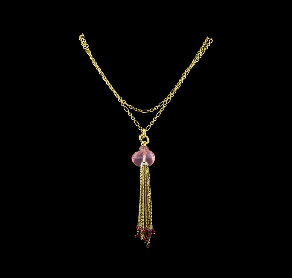 One electronically tested 18KT yellow gold ladies cast & assembled multi gemstone and diamond pendant/enhancer with chain. The pendant/enhancer features a tassel motif. Eighteen yellow gold chains with fourteen ruby bead accents make up the fringe of the tassel. The fringe is capped by a diamond ribbon detail. A faceted rose quartz bead is placed within the middle of the tassel and accented by a pink sapphire set cap. The tassel is completed by a hinged snap-locking roped detailed yellow gold bail. The pendant/enhancer is supported by a thirty-two inch length stylized three millimeter wide link chain, terminating in a lobster claw clasp with a David Yurman dangle tag. The pendant/enhancer is four inches in length. Bright polish finish with rhodium accents. Trademark is David Yurman. Identified with markings of "750". Condition is good. Containing: Fourteen bead cut natural rubies, measuring 3.00 x 2.90 x 2.00mm, approximate total weight of 2.00ct., type II, dark, very slightly brownish, slightly purplish red color, (GIA slpR 7/3), cut is good. Transmitting light very diffusely, opaque. Naturally occurring internal & external characteristics are present. Color grade is an average for the group. Graded in the setting. Forty bead set round mixed cut natural pink sapphires, measuring 1.30 - 1.20 x 0.81 mm, approximate total weight of 0.50ct., clarity is eye clean, type II, medium, very slightly brownish, slightly purplish red color, (GIA slpR 5/3), cut is good. Transmitting light with no distortion, transparent. Color grade is an average for the group. Graded in the setting. One briolette cut natural rose quartz, measuring 19.00 x 18.95 x 11.00mm, approximate weight of 22.80ct., clarity is slightly included, medium light, moderately strong, pink color, (GIA Pk 4/4), cut is good. Transmitting light with a minimum of distortion, transparent. Naturally occurring internal & external characteristics are present. Graded in the setting. Twelve bead set round brilliant cut diamonds, measuring 1.40 - 1.30 x 0.81mm (depth est.) approximate total weight of 12 Stones = 0.13ct. Graded in the setting. Clarity: VS-1 to VS-2. Color: F - G. Total Weight of Colored Stones 25.30ct. Total Weight of Diamonds 0.13ct. Total Weight of Pendant/Enhancer With Chain 38.89gm. AIG Appraised at $12,700.00.