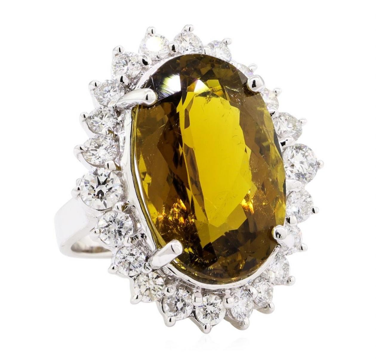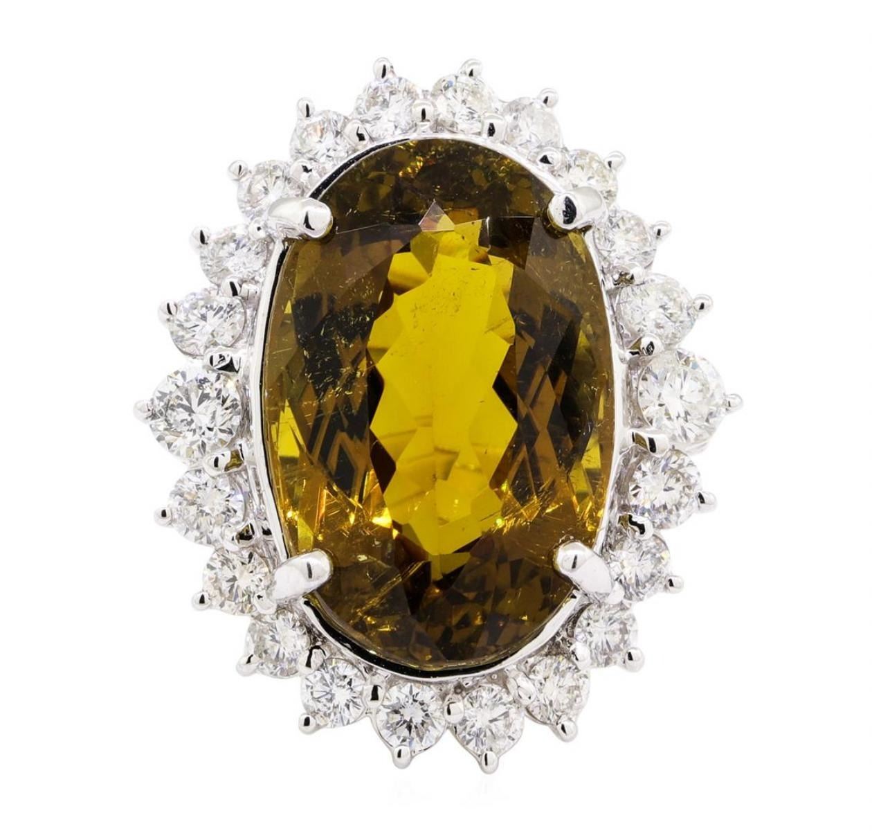 One electronically tested 14KT white gold lady's cast fashion ring with a basket halo with a bright polish finish. The featured lady's ring has a shank measuring 2.90 millimeters wide. Identified with markings of '14K'. Condition is new, good workmanship. Containing: One prong set oval modified mixed cut natural golden tourmaline, measuring 22.07 x 14.44 x 9.86mm, (depth est.) 12%. bulge factor, approximate weight of 22.85ct., clarity is eye clean, medium dark, brownish, yellowish orange color, (GIA yO 6/1), cut is very good. Transmitting light with no distortion, transparent. Colored gemstones are presumed to have been subjected to commonly used enhancement processes. Graded in the setting in the GIA Laboratory, Report #2183928822. Two prong set round brilliant cut diamonds, measuring 3.90 - 3.85 x 2.41mm (depth est.) approximate total weight of 2 Stones = 0.45ct. Graded in the setting. Color H - I Clarity SI-2 Cut Good Twenty prong set round brilliant cut diamonds, measuring 3.20 - 2.80 x 1.80mm (depth est.) approximate total weight of 20 Stones = 2.00ct. Graded in the setting. Color H - I Clarity SI-1 to SI-2 Cut Good. Total Weight of Colored Stones 22.85ct.. Total Weight of Diamonds 2.45ct.. Total Weight of Ring 13.80gm GAS Appraised at $21445.00. GAS Appraised.