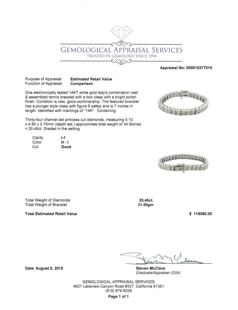 One electronically tested 14KT white gold lady's combination cast & assembled tennis bracelet with a box clasp with a bright polish finish. The featured bracelet has a plunger style clasp with figure 8 safety and is 7 inches in length. Identified with markings of "14K". Condition is new, good workmanship. Containing: Thirty-Four channel set princess cut diamonds, measuring 5.10 x 4.80 x 3.70mm (depth est.) approximate. Total Weight of 34 Stones = 25.45ct. Graded in the setting. Clarity: I-1. Color: H - I. Cut Good. Total Weight of Diamonds 25.45ct. Total Weight of Bracelet 31.50gm. GAS Appraised at $118,080.00.