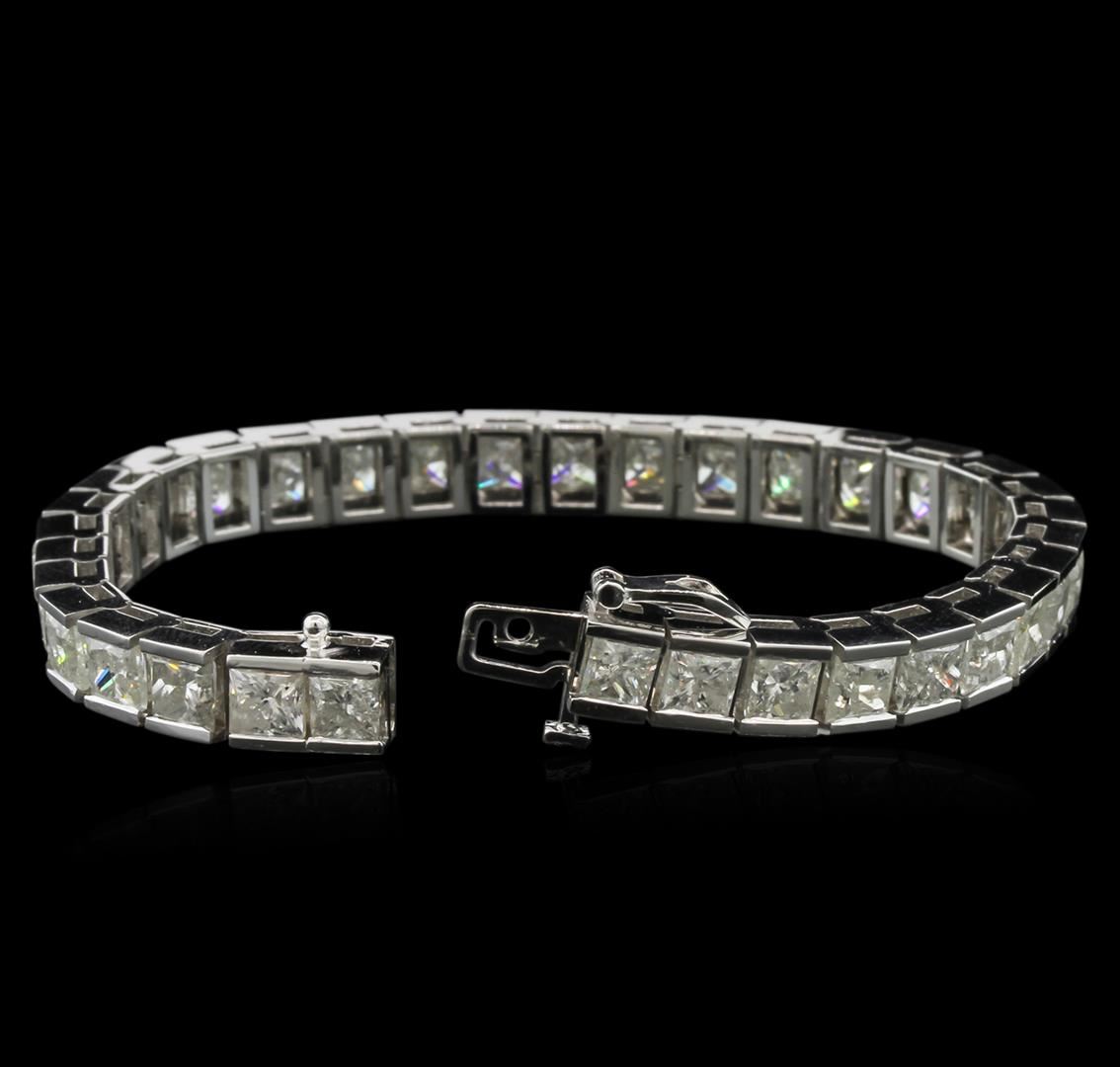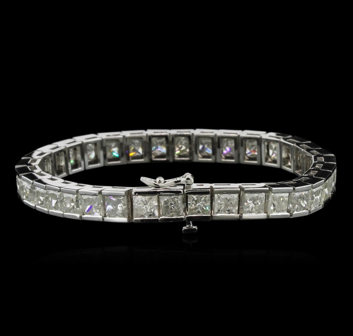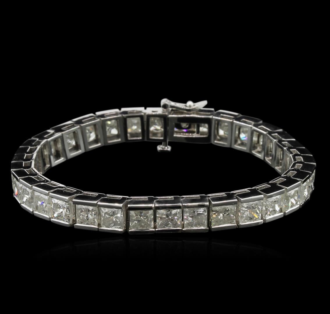 One electronically tested 14KT white gold lady's combination cast & assembled tennis bracelet with a box clasp with a bright polish finish. The featured bracelet has a plunger style clasp with figure 8 safety and is 7 inches in length. Identified with markings of "14K". Condition is new, good workmanship. Containing: Thirty-Four channel set princess cut diamonds, measuring 5.10 x 4.80 x 3.70mm (depth est.) approximate. Total Weight of 34 Stones = 25.45ct. Graded in the setting. Clarity: I-1. Color: H - I. Cut Good. Total Weight of Diamonds 25.45ct. Total Weight of Bracelet 31.50gm. GAS Appraised at $118,080.00.