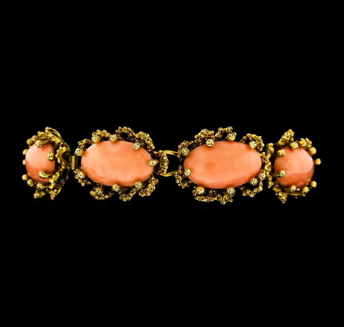 One electronically tested 10KT yellow gold lady's combination cast & assembled fashion bracelet with a tongue clasp with foldover safety with a bright polish finish. The featured lady's bracelet has basket links and measures approximately seven inches in length. Identified with markings of '10K'. Condition is used, good workmanship. Containing: Two prong set oval cabochon cut natural pink corals, measuring 18.85 x 10.90 x 4.85mm, (depth est.) approximate total weight of 14.25ct., medium light, moderately strong, reddish orange color, (GIA rO 4/4), cut is very good. Graded in the setting. Two prong set oval cabochon cut natural pink corals, measuring 17.15 x 10.70 x 4.30mm, (depth est.) approximate total weight of 11.30ct., medium light, moderately strong, reddish orange color, (GIA rO 4/4), cut is very good. Graded in the setting. Total Weight of Colored Stones 25.55ct.. Total Weight of Bracelet 37.40gm. GAS Appraised at $4,025.00.