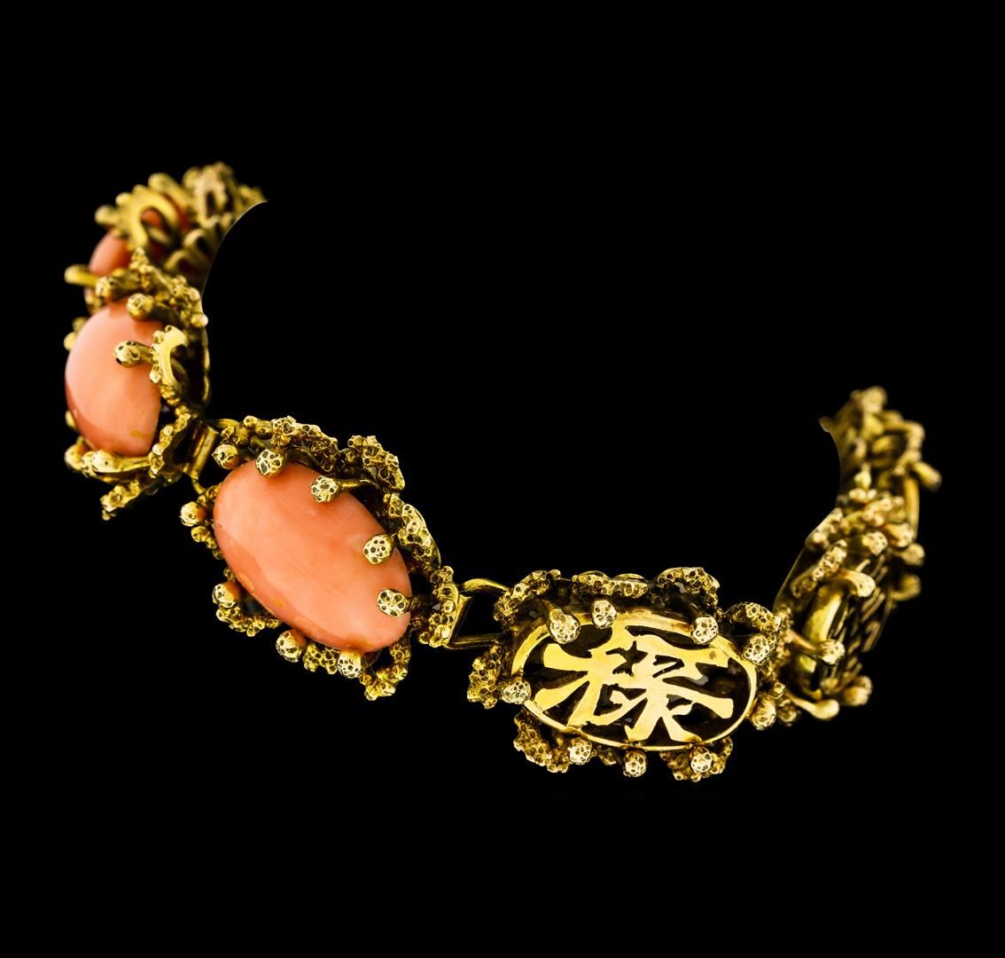 One electronically tested 10KT yellow gold lady's combination cast & assembled fashion bracelet with a tongue clasp with foldover safety with a bright polish finish. The featured lady's bracelet has basket links and measures approximately seven inches in length. Identified with markings of '10K'. Condition is used, good workmanship. Containing: Two prong set oval cabochon cut natural pink corals, measuring 18.85 x 10.90 x 4.85mm, (depth est.) approximate total weight of 14.25ct., medium light, moderately strong, reddish orange color, (GIA rO 4/4), cut is very good. Graded in the setting. Two prong set oval cabochon cut natural pink corals, measuring 17.15 x 10.70 x 4.30mm, (depth est.) approximate total weight of 11.30ct., medium light, moderately strong, reddish orange color, (GIA rO 4/4), cut is very good. Graded in the setting. Total Weight of Colored Stones 25.55ct.. Total Weight of Bracelet 37.40gm. GAS Appraised at $4,025.00.