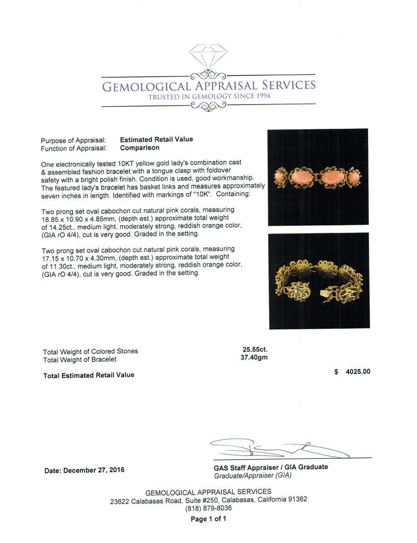 One electronically tested 10KT yellow gold lady's combination cast & assembled fashion bracelet with a tongue clasp with foldover safety with a bright polish finish. The featured lady's bracelet has basket links and measures approximately seven inches in length. Identified with markings of '10K'. Condition is used, good workmanship. Containing: Two prong set oval cabochon cut natural pink corals, measuring 18.85 x 10.90 x 4.85mm, (depth est.) approximate total weight of 14.25ct., medium light, moderately strong, reddish orange color, (GIA rO 4/4), cut is very good. Graded in the setting. Two prong set oval cabochon cut natural pink corals, measuring 17.15 x 10.70 x 4.30mm, (depth est.) approximate total weight of 11.30ct., medium light, moderately strong, reddish orange color, (GIA rO 4/4), cut is very good. Graded in the setting. Total Weight of Colored Stones 25.55ct.. Total Weight of Bracelet 37.40gm. GAS Appraised at $4,025.00.