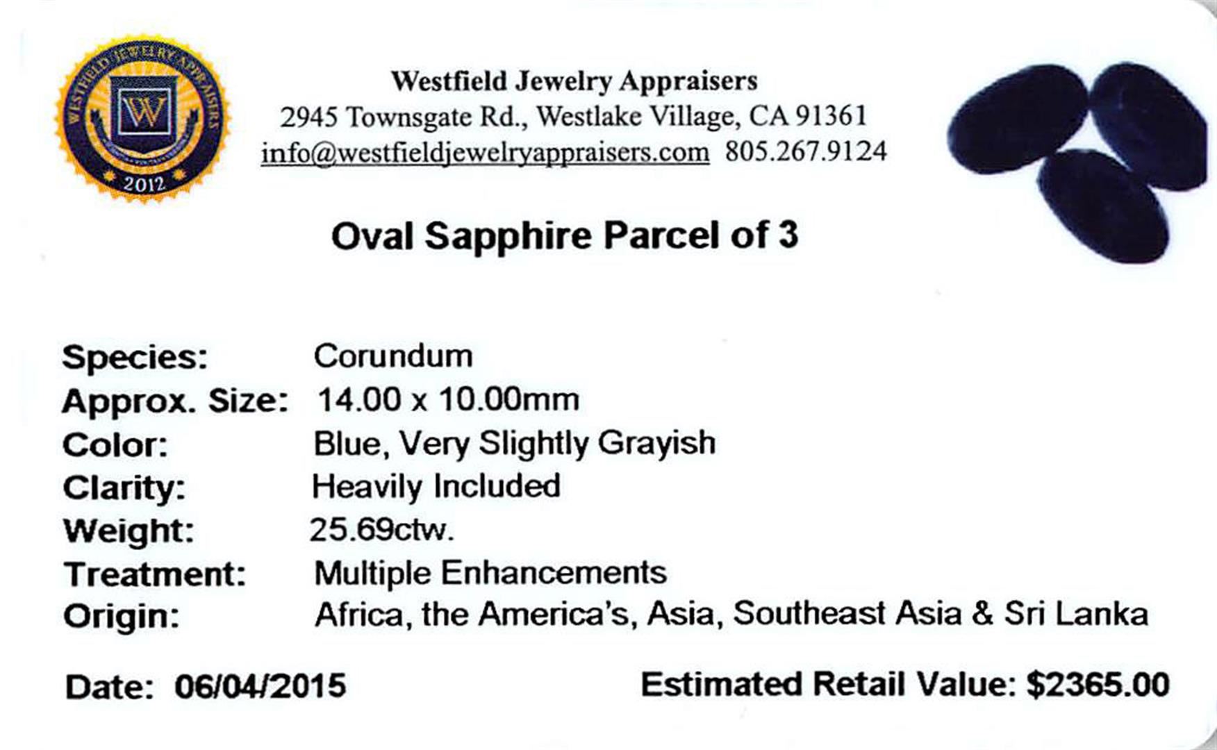 Three oval mixed cut natural blue sapphires, measuring 14.00 x 10.00 x 6.50mm, exact total weight 25.69ct., clarity is heavily included, type II, very dark, very slightly grayish, blue color, (GIA B 8/3), cut is good. Measurements are an average for the group. Transmitting light very diffusely, opaque, Naturally occurring internal & external characteristics are present, Indications of multiple laboratory enhancements, including high temperature heat treatment. Westfield Appraised at $2,365.00.