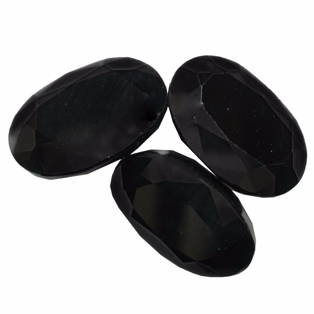 Three oval mixed cut natural blue sapphires, measuring 14.00 x 10.00 x 6.50mm, exact total weight 25.69ct., clarity is heavily included, type II, very dark, very slightly grayish, blue color, (GIA B 8/3), cut is good. Measurements are an average for the group. Transmitting light very diffusely, opaque, Naturally occurring internal & external characteristics are present, Indications of multiple laboratory enhancements, including high temperature heat treatment. Westfield Appraised at $2,365.00.