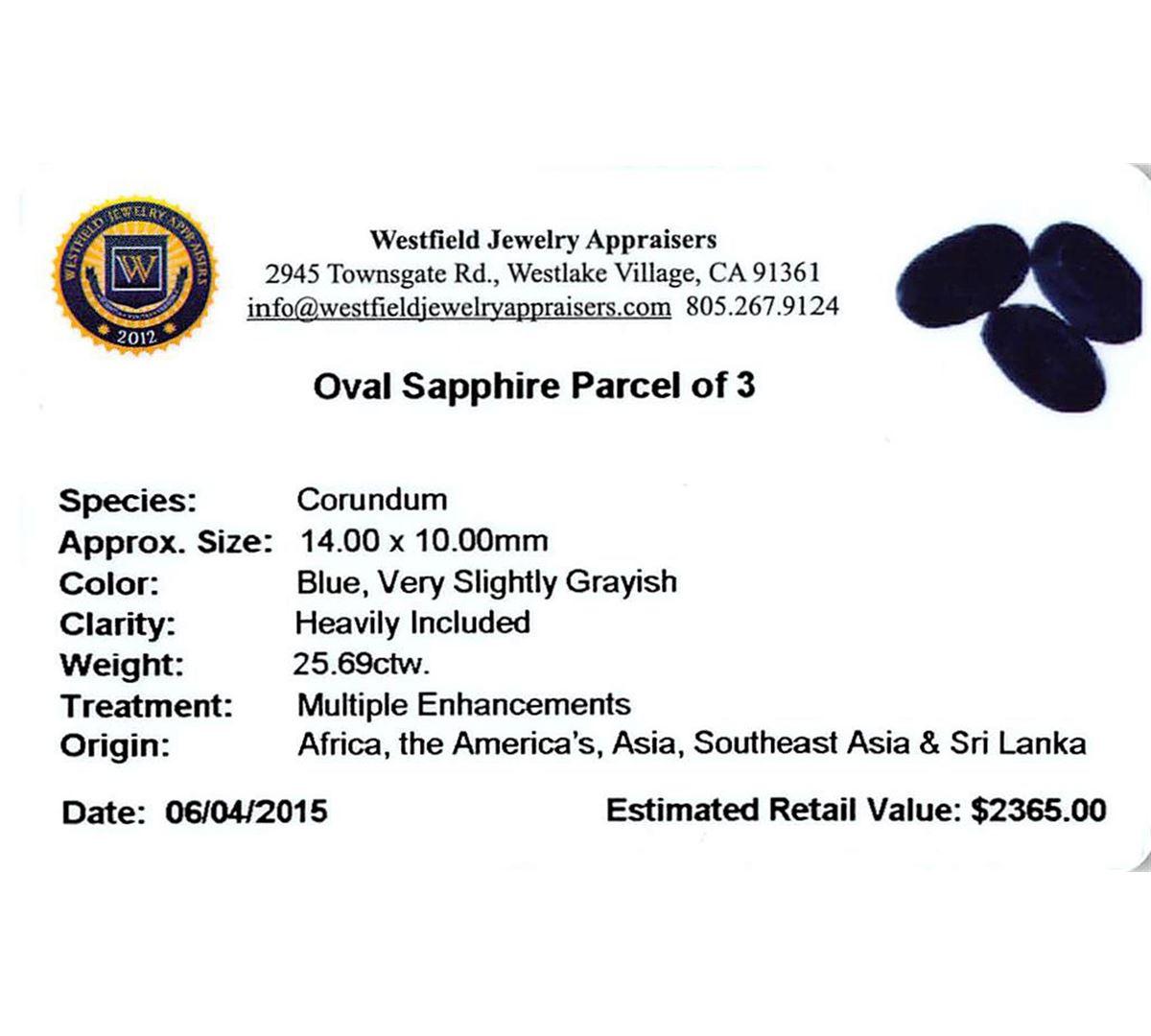 Three oval mixed cut natural blue sapphires, measuring 14.00 x 10.00 x 6.50mm, exact total weight 25.69ct., clarity is heavily included, type II, very dark, very slightly grayish, blue color, (GIA B 8/3), cut is good. Measurements are an average for the group. Transmitting light very diffusely, opaque, Naturally occurring internal & external characteristics are present, Indications of multiple laboratory enhancements, including high temperature heat treatment. Westfield Appraised at $2,365.00.