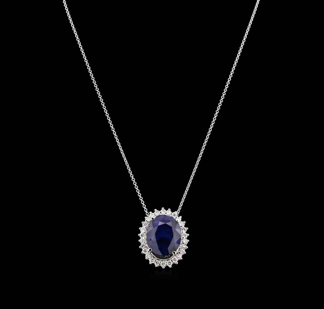 One electronically tested 14KT white gold lady's cast fashion pendant & chain 16.0" long, 1mm round cable link with a lobster claw clasp with a bright polish finish. Identified with markings of "14K". Condition is new, good workmanship. Containing: One prong set oval modified brilliant cut natural blue sapphire, measuring 18.65 x 15.66 x 10.40mm, approximate weight of 25.71ct., clarity is severely included, type II, dark, very slightly grayish, blue color, (GIA B 7/3), cut is good. Transmitting light diffusely, opaque to translucent. Indications of laboratory high temperature heat treatment, with glass & flux additives. Graded in the setting. Twenty-Six prong set round brilliant cut diamonds, measuring 2.50 - 2.45 x 1.49mm (depth est.) approximate total weight of 26 Stones = 1.47ct. Graded in the setting. Clarity: VS-2 to SI-1. Color: H - Good. Total Weight of Colored Stones 25.71ct. Total Weight of Diamonds 1.47ct. Total Weight of Pendant & Chain 19.30gm. GAS Appraised at $11,040.00.