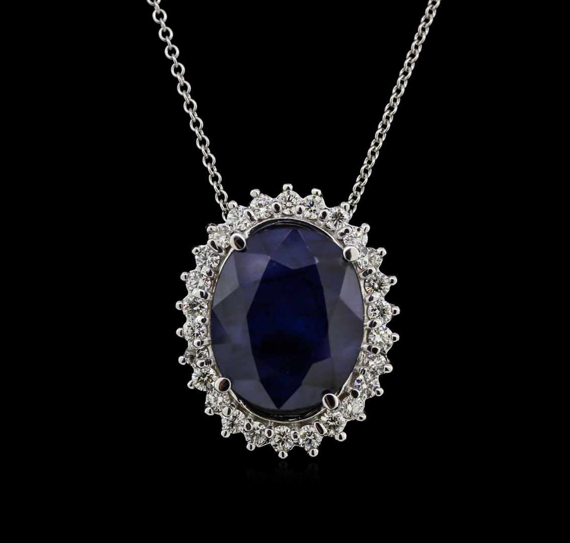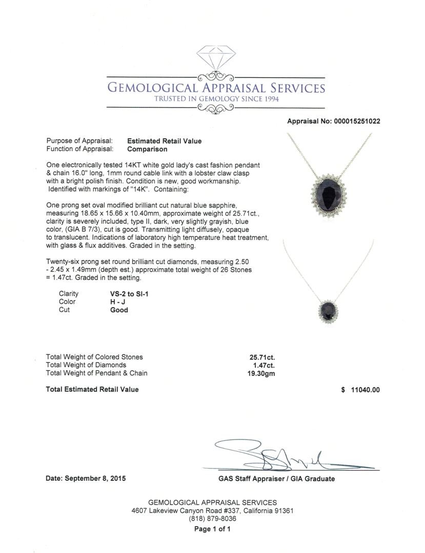 One electronically tested 14KT white gold lady's cast fashion pendant & chain 16.0" long, 1mm round cable link with a lobster claw clasp with a bright polish finish. Identified with markings of "14K". Condition is new, good workmanship. Containing: One prong set oval modified brilliant cut natural blue sapphire, measuring 18.65 x 15.66 x 10.40mm, approximate weight of 25.71ct., clarity is severely included, type II, dark, very slightly grayish, blue color, (GIA B 7/3), cut is good. Transmitting light diffusely, opaque to translucent. Indications of laboratory high temperature heat treatment, with glass & flux additives. Graded in the setting. Twenty-Six prong set round brilliant cut diamonds, measuring 2.50 - 2.45 x 1.49mm (depth est.) approximate total weight of 26 Stones = 1.47ct. Graded in the setting. Clarity: VS-2 to SI-1. Color: H - Good. Total Weight of Colored Stones 25.71ct. Total Weight of Diamonds 1.47ct. Total Weight of Pendant & Chain 19.30gm. GAS Appraised at $11,040.00.
