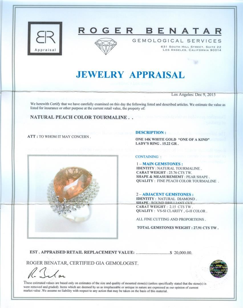 One 14KT White Gold "One of a Kind" Lady's Ring, 15.22 grams. Containing: Main Gemstones: Identity: Natural Tourmaline. Carat Weight: 25.76 cts tw. Shape & Measurement: Pear Shape. Quality: Fine Peach Color Tourmaline. Adjacent Gemstones: Identity: Natural Diamond. Shape: Round Brilliant Cut. Carat Weight: 2.15 cts tw. Quality: VS-SI Clarity, G-H Color. All fine cutting and proportions. Total Gemstones Weight: 27.91 cts tw. RBGS Appraised at $20,000.00.