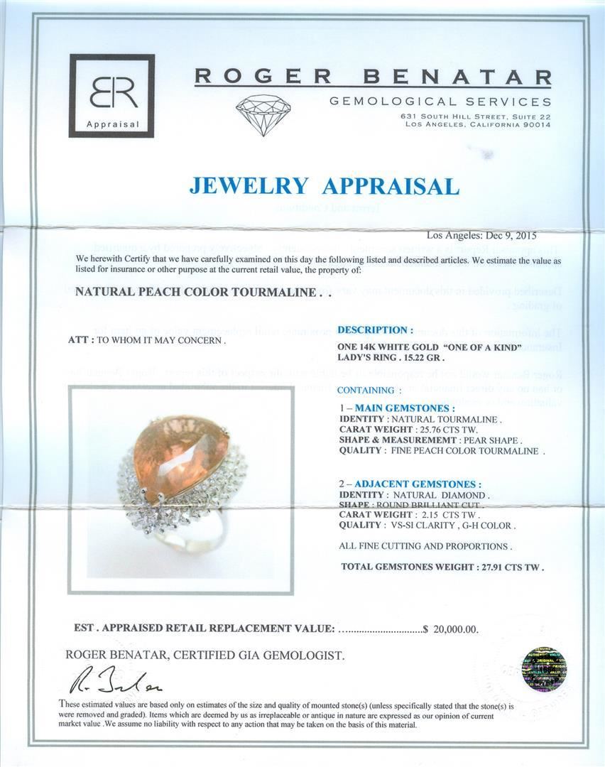 One 14KT White Gold "One of a Kind" Lady's Ring, 15.22 grams. Containing: Main Gemstones: Identity: Natural Tourmaline. Carat Weight: 25.76 cts tw. Shape & Measurement: Pear Shape. Quality: Fine Peach Color Tourmaline. Adjacent Gemstones: Identity: Natural Diamond. Shape: Round Brilliant Cut. Carat Weight: 2.15 cts tw. Quality: VS-SI Clarity, G-H Color. All fine cutting and proportions. Total Gemstones Weight: 27.91 cts tw. RBGS Appraised.