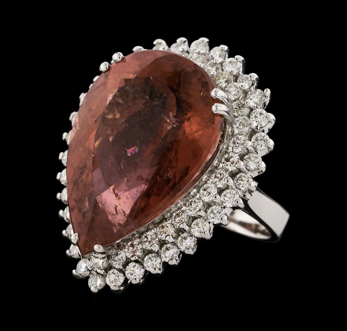One 14KT White Gold "One of a Kind" Lady's Ring, 15.22 grams. Containing: Main Gemstones: Identity: Natural Tourmaline. Carat Weight: 25.76 cts tw. Shape & Measurement: Pear Shape. Quality: Fine Peach Color Tourmaline. Adjacent Gemstones: Identity: Natural Diamond. Shape: Round Brilliant Cut. Carat Weight: 2.15 cts tw. Quality: VS-SI Clarity, G-H Color. All fine cutting and proportions. Total Gemstones Weight: 27.91 cts tw. RBGS Appraised.