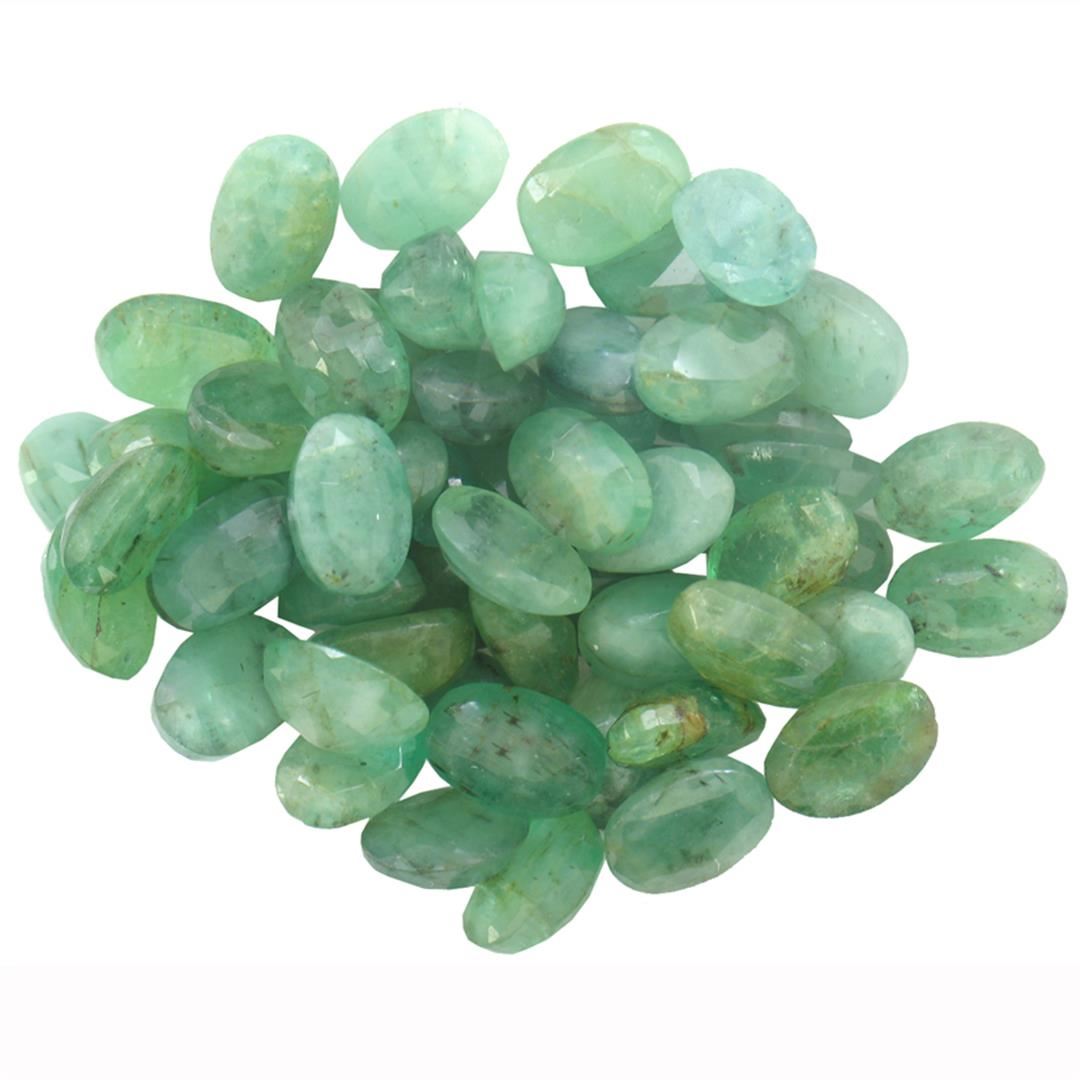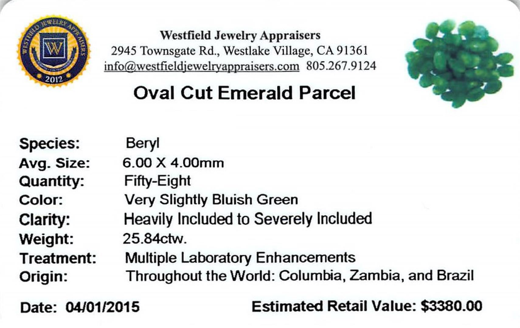 Fifty-eight oval mixed cut natural emeralds exact total weight 25.84ct., clarity is heavily included, type III, medium dark, very slightly grayish, very slightly bluish green color, (GIA vslbG 6/3), cut is good. Westfield Appraised at $3,380.00.