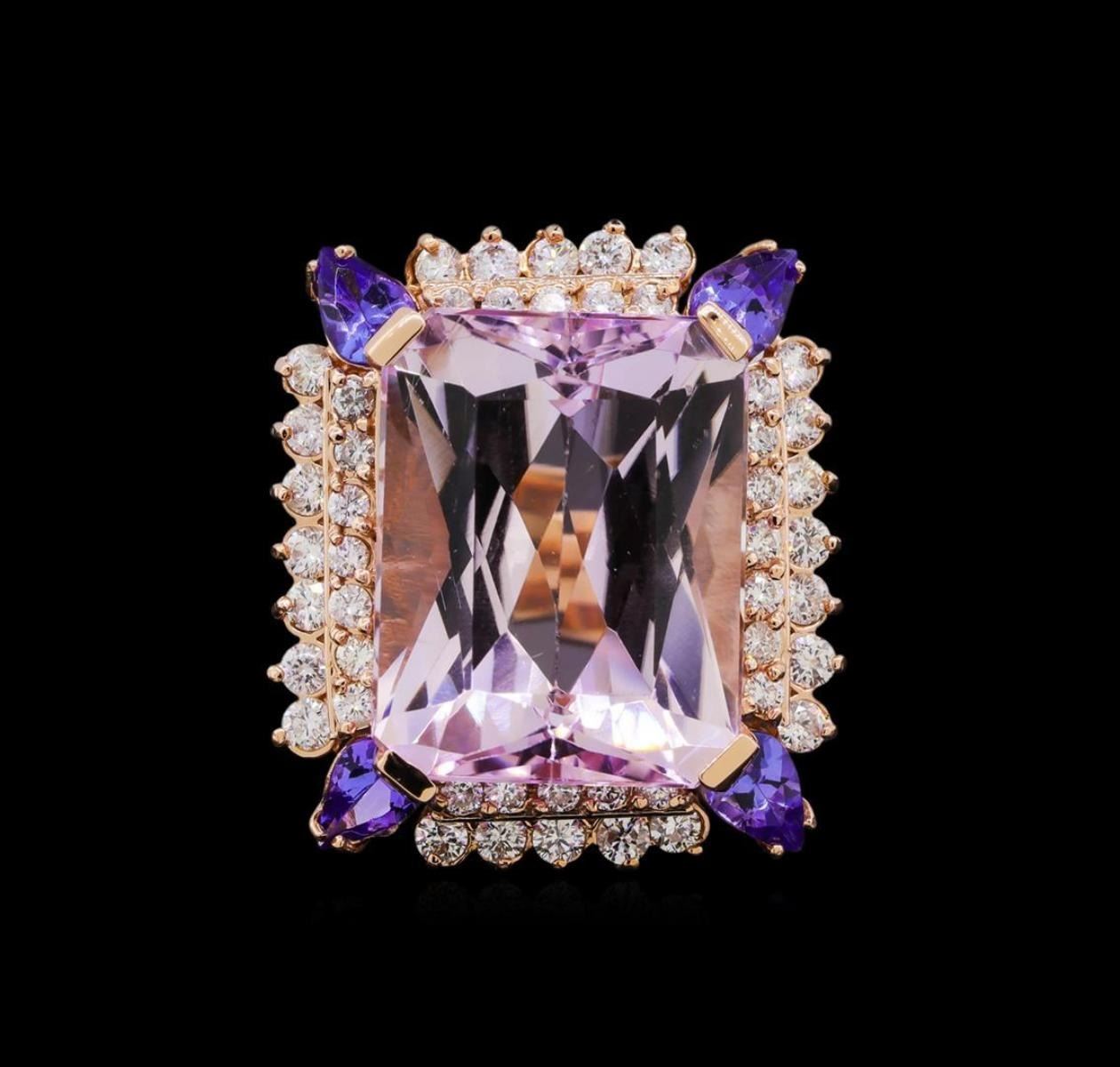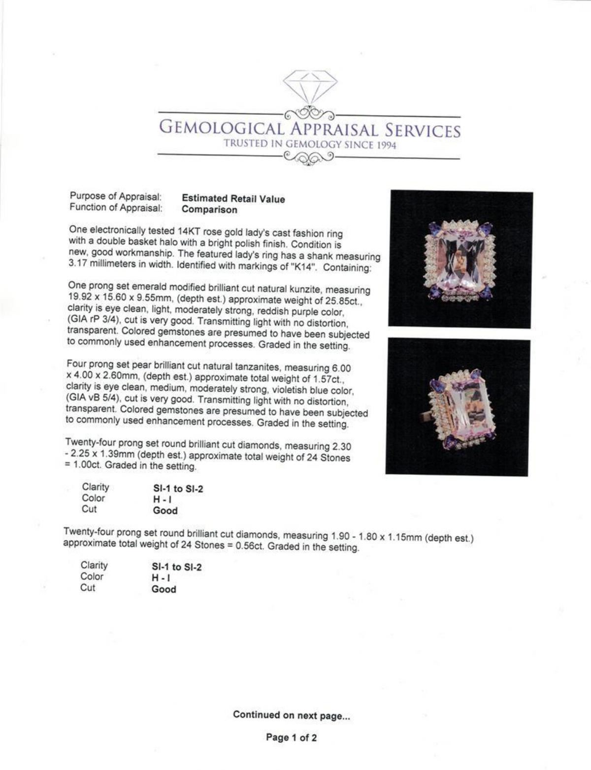 One electronically tested 14KT rose gold lady's cast fashion ring with a double basket halo with a bright polish finish. The featured lady's ring has a shank measuring 3.17 millimeters in width. Identified with markings of "K14". Condition is new, good workmanship. Containing: One prong set emerald modified brilliant cut natural kunzite, measuring 19.92 x 15.60 x 9.55mm, (depth est.) approximate weight of 25.85ct., clarity is eye clean, light, moderately strong, reddish purple color, (GIA rP 3/4), cut is very good. Transmitting light with no distortion, transparent. Colored gemstones are presumed to have been subjected to commonly used enhancement processes. Graded in the setting. Four prong set pear brilliant cut natural tanzanites, measuring 6.00 x 4.00 x 2.60mm, (depth est.) approximate total weight of 1.57ct., clarity is eye clean, medium, moderately strong, violetish blue color, (GIA vB 5/4), cut is very good. Transmitting light with no distortion, transparent. Colored gemstones are presumed to have been subjected to commonly used enhancement processes. Graded in the setting. Twenty-Four prong set round brilliant cut diamonds, measuring 2.30 - 2.25 x 1.39mm (depth est.) approximate total weight of 24 Stones = 1.00ct. Graded in the setting. Clarity: SI-1 to SI-2. Color: H - I. Cut Good Twenty-Four prong set round brilliant cut diamonds, measuring 1.90 - 1.80 x 1.15mm (depth est.) approximate total weight of 24 Stones = 0.56ct. Graded in the setting. Clarity: SI-1 to SI-2. Color: H - I. Cut Good. Total Weight of Colored Stones 27.42ct. Total Weight of Diamonds 1.56ct. Total Weight of Ring 17.00gm. GAS Appraised.