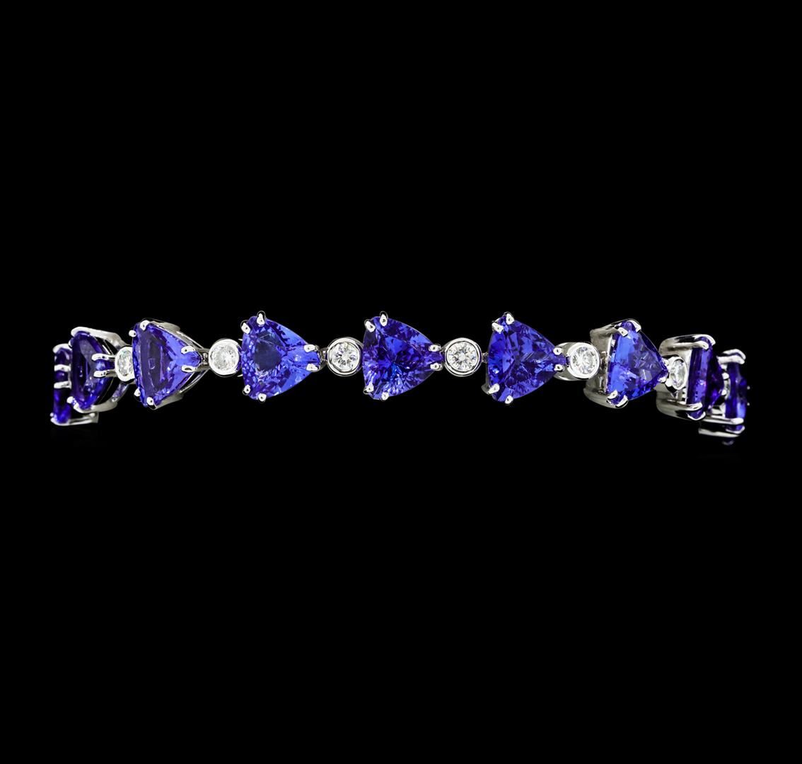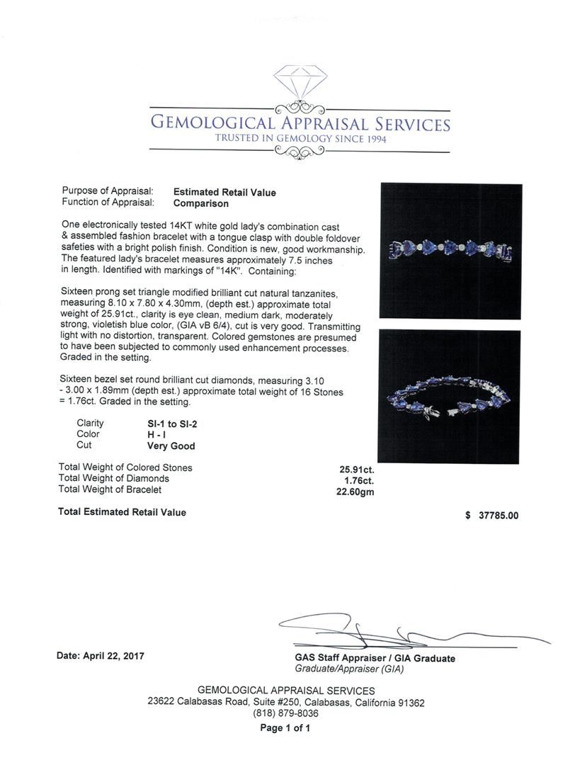 One electronically tested 14KT white gold lady's combination cast & assembled fashion bracelet with a tongue clasp with double foldover safeties with a bright polish finish. The featured lady's bracelet measures approximately 7.5 inches in length. Identified with markings of '14K'. Condition is new, good workmanship. Containing: Sixteen prong set triangle modified brilliant cut natural tanzanites, measuring 8.10 x 7.80 x 4.30mm, (depth est.) approximate total weight of 25.91ct., clarity is eye clean, medium dark, moderately strong, violetish blue color, (GIA vB 6/4), cut is very good. Transmitting light with no distortion, transparent. Colored gemstones are presumed to have been subjected to commonly used enhancement processes. Graded in the setting. Sixteen bezel set round brilliant cut diamonds, measuring 3.10 - 3.00 x 1.89mm (depth est.) approximate total weight of 16 Stones = 1.76ct. Graded in the setting. Color H - I Clarity SI-1 to SI-2 Cut Very Good. Total Weight of Colored Stones 25.91ct.. Total Weight of Diamonds 1.76ct.. Total Weight of Bracelet 22.60gm GAS Appraised at $37785.00. GAS Appraised at $37,785.00.