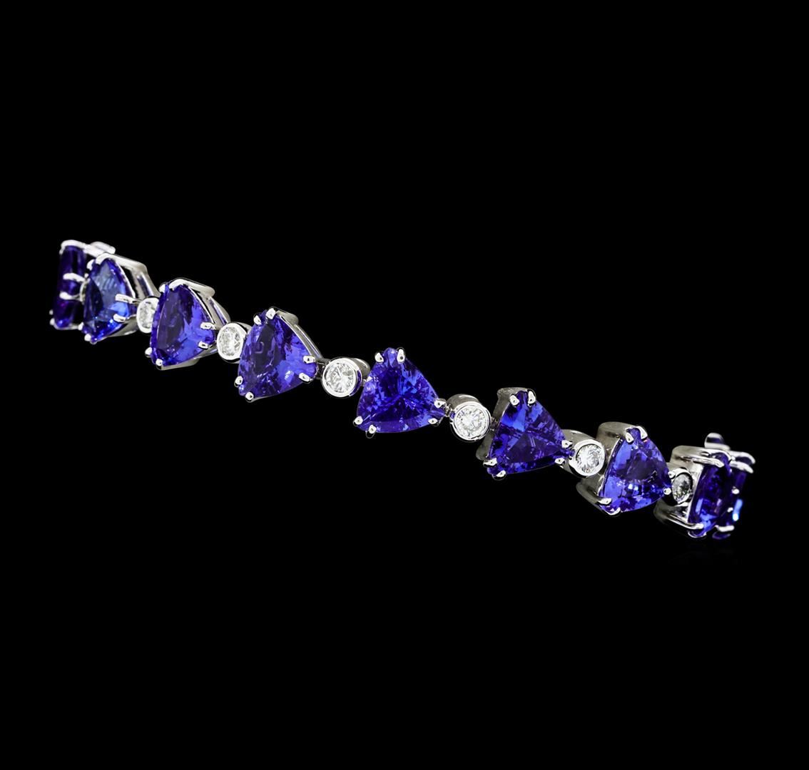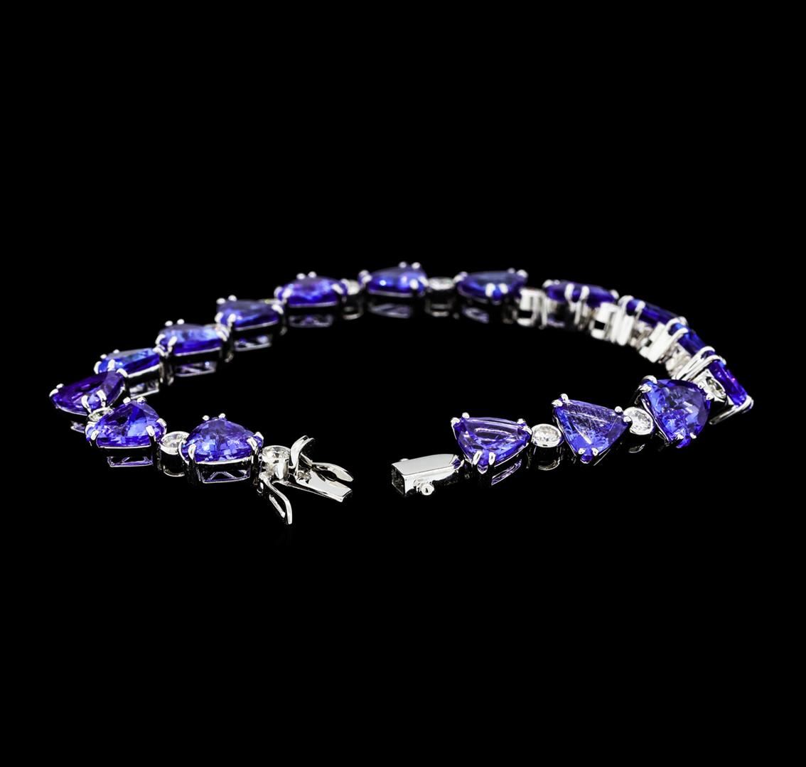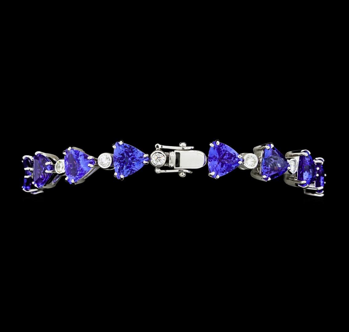 One electronically tested 14KT white gold lady's combination cast & assembled fashion bracelet with a tongue clasp with double foldover safeties with a bright polish finish. The featured lady's bracelet measures approximately 7.5 inches in length. Identified with markings of '14K'. Condition is new, good workmanship. Containing: Sixteen prong set triangle modified brilliant cut natural tanzanites, measuring 8.10 x 7.80 x 4.30mm, (depth est.) approximate total weight of 25.91ct., clarity is eye clean, medium dark, moderately strong, violetish blue color, (GIA vB 6/4), cut is very good. Transmitting light with no distortion, transparent. Colored gemstones are presumed to have been subjected to commonly used enhancement processes. Graded in the setting. Sixteen bezel set round brilliant cut diamonds, measuring 3.10 - 3.00 x 1.89mm (depth est.) approximate total weight of 16 Stones = 1.76ct. Graded in the setting. Color H - I Clarity SI-1 to SI-2 Cut Very Good. Total Weight of Colored Stones 25.91ct.. Total Weight of Diamonds 1.76ct.. Total Weight of Bracelet 22.60gm GAS Appraised at $37785.00. GAS Appraised at $37,785.00.