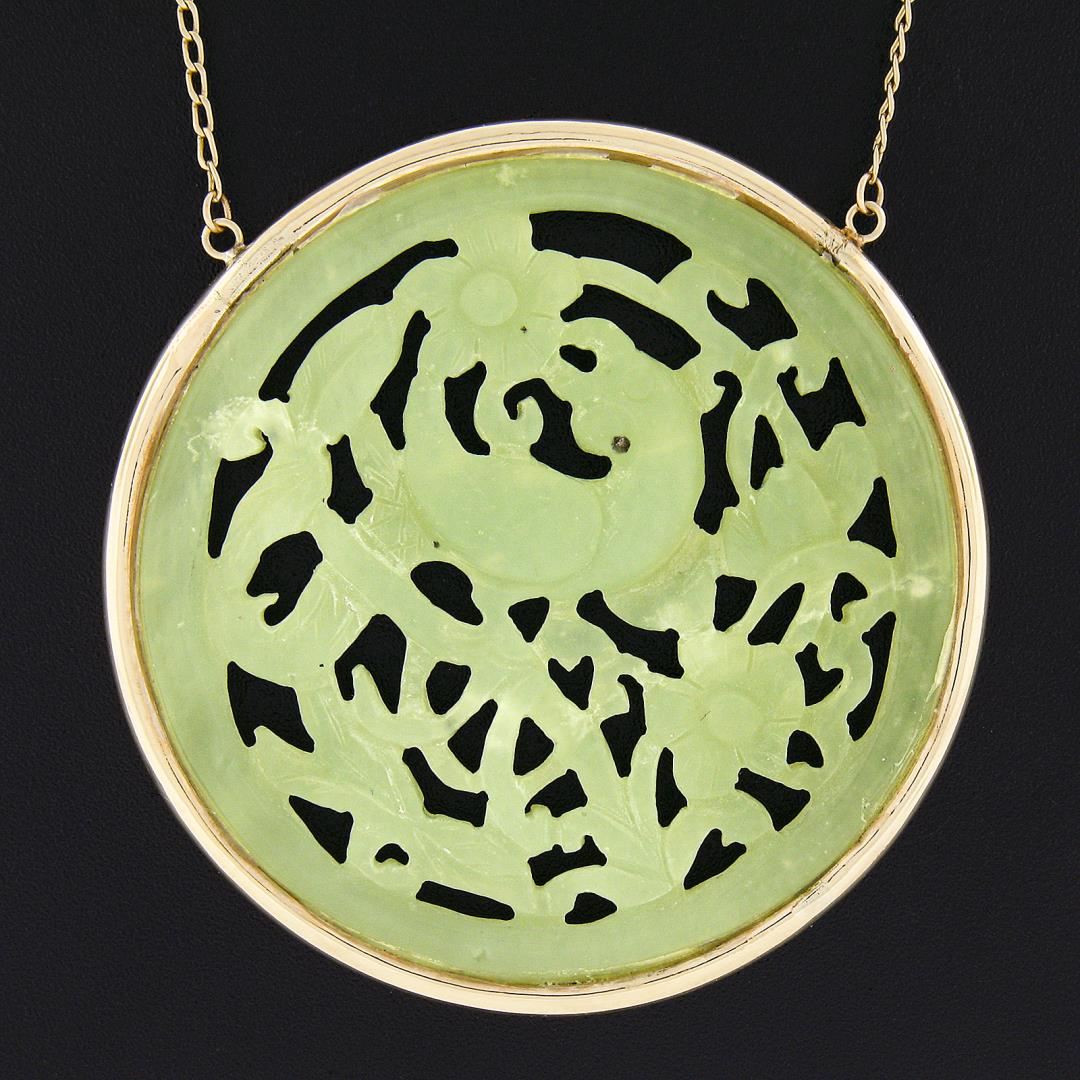 A vintage solid 14k yellow gold pendant necklace, featuring 1 round carved pierced natural jade (54.3mm). The pendant weighs a total of 28.40 grams, measures 59.30mm in diameter, and 25 inch curb link chain.