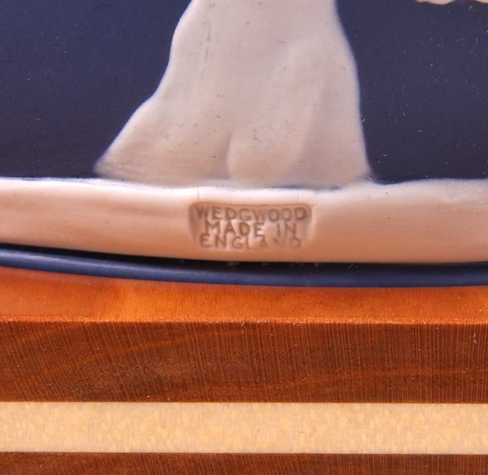 New in box 100% authentic Wedgwood large Portland vase with stand. This is the 250th prestige collection. Limited to only 50 pieces in the world. Handmade in the United Kingdom. White on Saxon blue jasper with wooden Portland stand. In the center top, there is a mirror built in that reflects beautifully the bottom of the vase. Comes with color collector book. Retailed for $20,000.00.