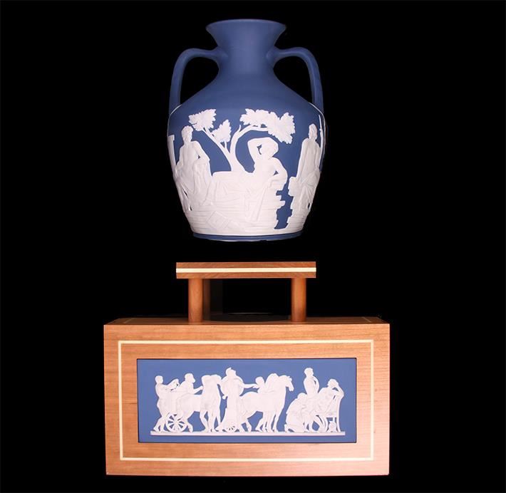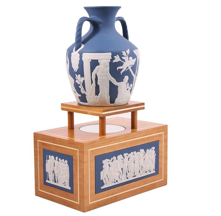 New in box 100% authentic Wedgwood large Portland vase with stand. This is the 250th prestige collection. Limited to only 50 pieces in the world. Handmade in the United Kingdom. White on Saxon blue jasper with wooden Portland stand. In the center top, there is a mirror built in that reflects beautifully the bottom of the vase. Comes with color collector book. Retailed for $20,000.00.
