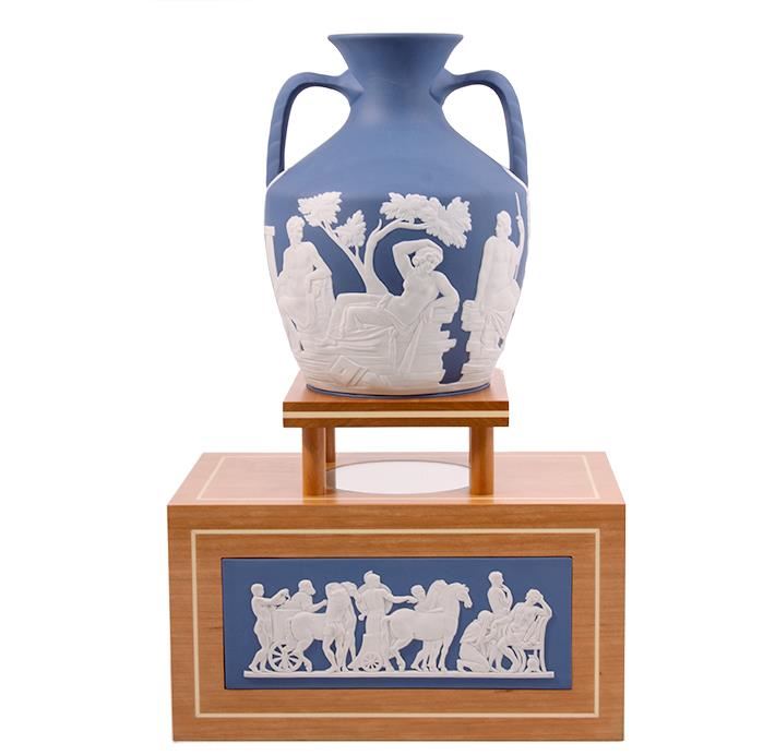 New in box 100% authentic Wedgwood large Portland vase with stand. This is the 250th prestige collection. Limited to only 50 pieces in the world. Handmade in the United Kingdom. White on Saxon blue jasper with wooden Portland stand. In the center top, there is a mirror built in that reflects beautifully the bottom of the vase. Comes with color collector book. Retailed for $20,000.00.