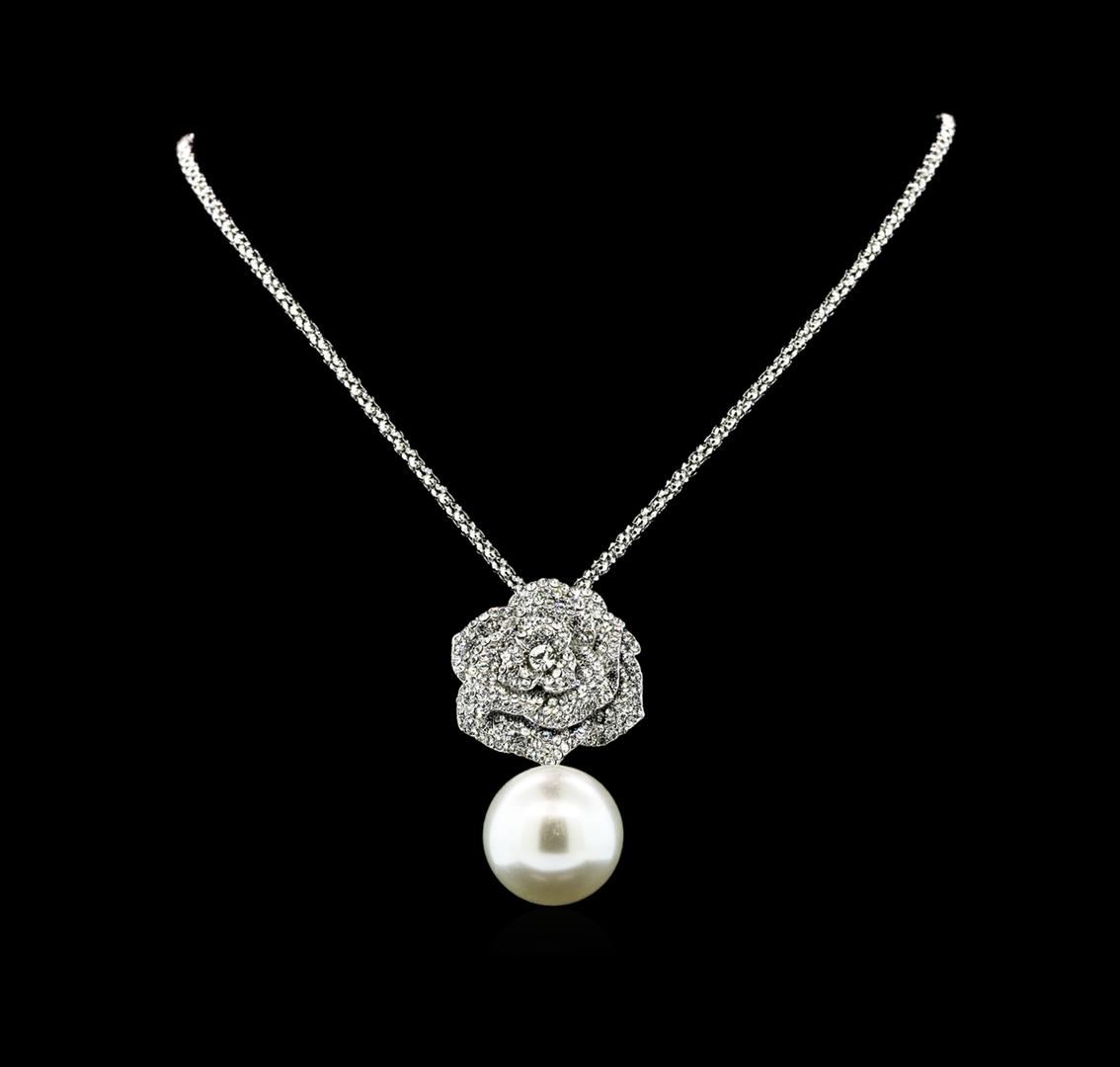 High end designer jewelry. 25mm Seashell Crystal Rose Pendant - Silver Plated. Silver Plated Chain/(2") Ext Clasp. White/ Silver. 30/2inches.