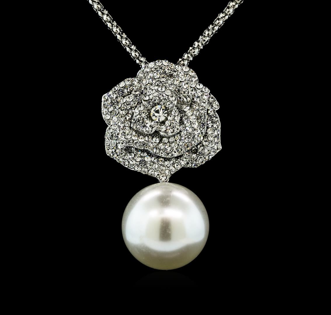 High end designer jewelry. 25mm Seashell Crystal Rose Pendant - Silver Plated. Silver Plated Chain/(2") Ext Clasp. White/ Silver. 30/2inches.