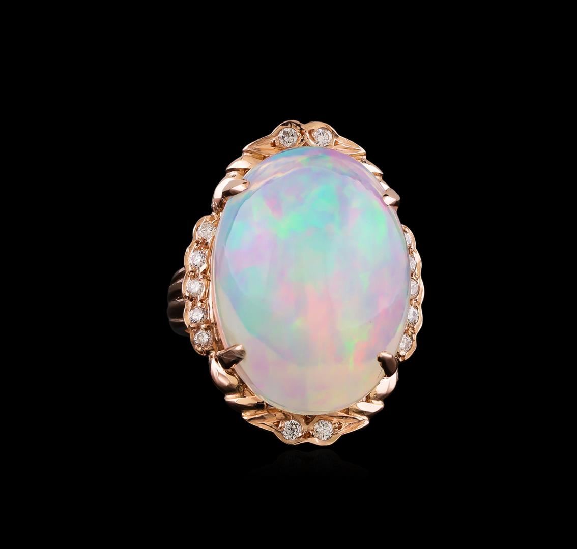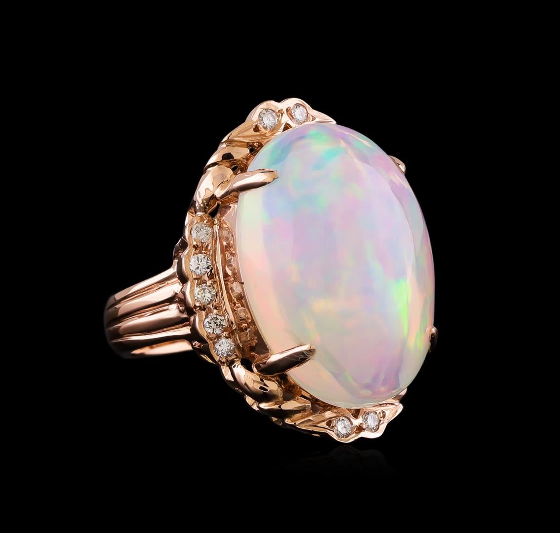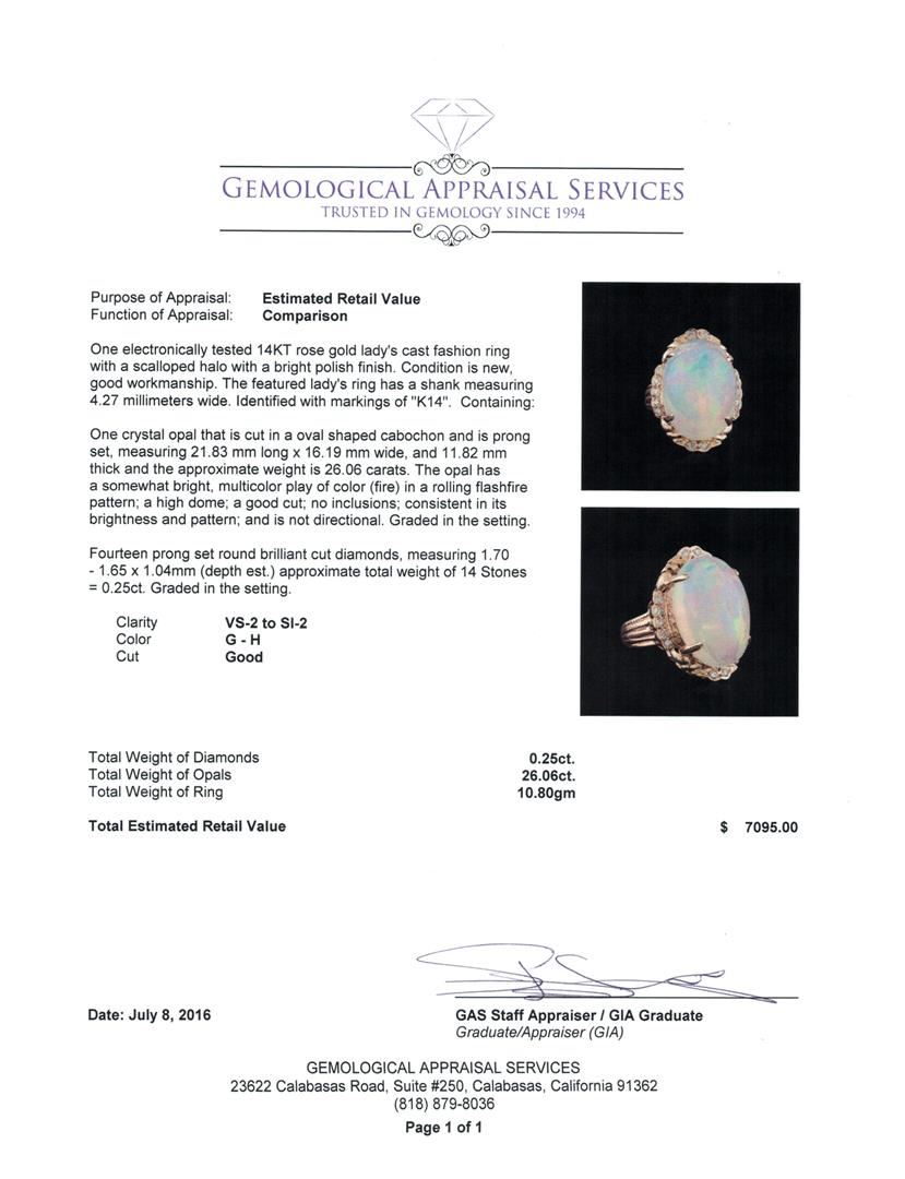 One electronically tested 14KT rose gold lady's cast fashion ring with a scalloped halo with a bright polish finish. The featured lady's ring has a shank measuring 4.27 millimeters wide. Identified with markings of "K14". Condition is new, good workmanship. Containing: One crystal opal that is cut in a oval shaped cabochon and is prong set, measuring 21.83 mm long x 16.19 mm wide, and 11.82 mm thick and the approximate weight is 26.06 carats. The opal has a somewhat bright, multicolor play of color (fire) in a rolling flashfire pattern; a high dome; a good cut; no inclusions; consistent in its brightness and pattern; and is not directional. Graded in the setting. Fourteen prong set round brilliant cut diamonds, measuring 1.70 - 1.65 x 1.04mm (depth est.) approximate total weight of 14 Stones = 0.25ct. Graded in the setting. Clarity: VS-2 to SI-2. Color: G - Good. Total Weight of Diamonds 0.25ct. Total Weight of Opals 26.06ct. Total Weight of Ring 10.80gm. GAS Appraised at $7,095.00.