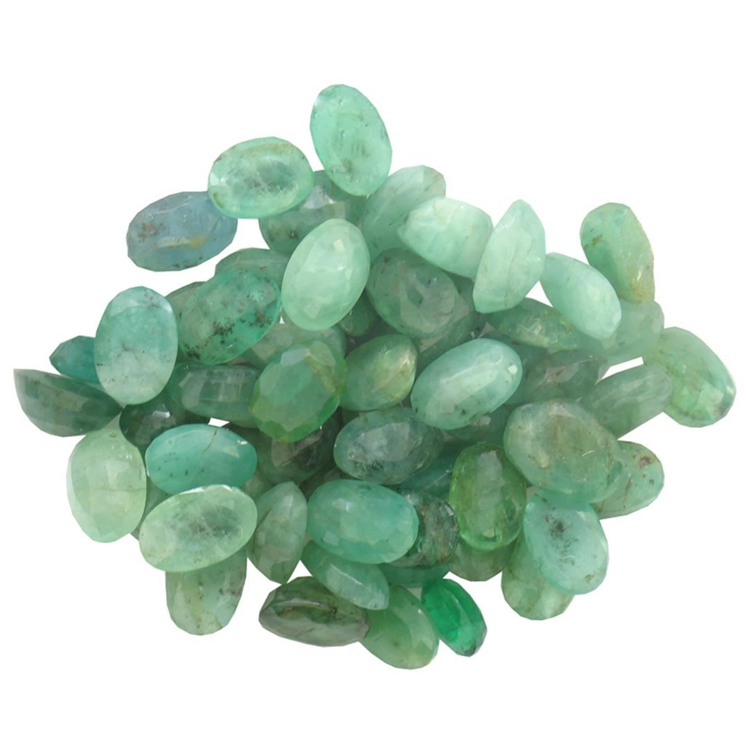 Sixty-three oval mixed cut natural emeralds exact total weight 26.11ct., clarity is heavily included, type III, medium dark, very slightly grayish, very slightly bluish green color, (GIA vslbG 6/3), cut is good. Westfield Appraised at $3,420.00.