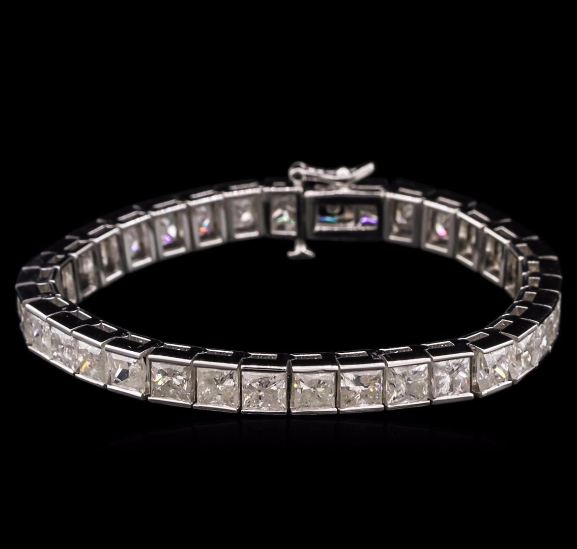 One electronically tested 14KT white gold lady's combination cast & assembled tennis bracelet with a tongue clasp with fold over safety with a bright polish finish. The featured lady's bracelet measures 7" in length. Identified with markings of "14K". Condition is new, good workmanship. Containing: Thirty-Four channel set princess cut diamonds, measuring 5.20 x 4.80 x 3.74mm (depth est.) , 1.00.% GTCF approximate total weight of 34 Stones = 26.35ct. Graded in the setting. Clarity: I-1. Color: H - Good. Total Weight of Diamonds 26.35ct. Total Weight of Bracelet 29.60gm. GAS Appraised at $91,845.00.