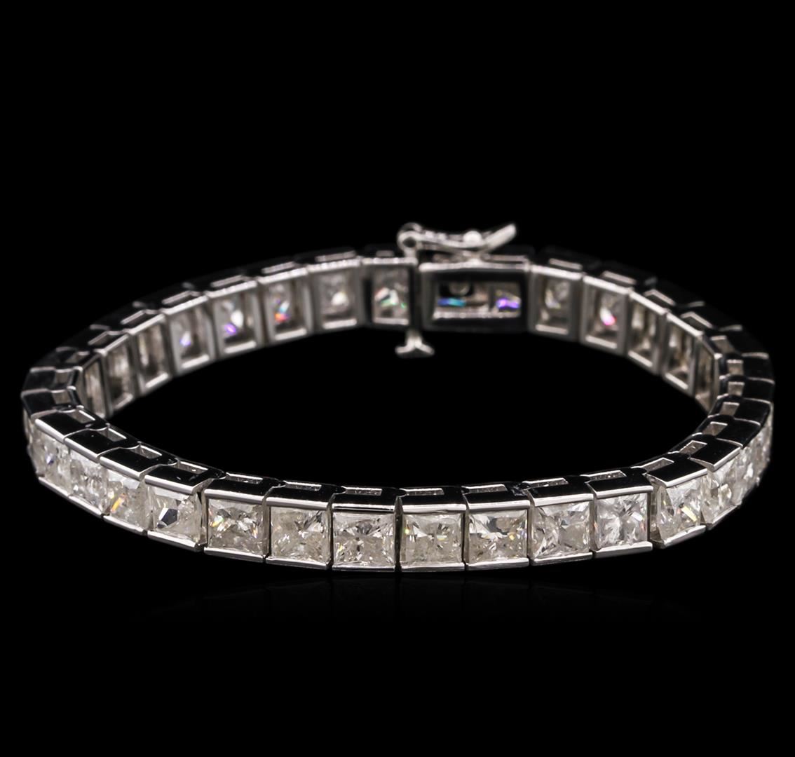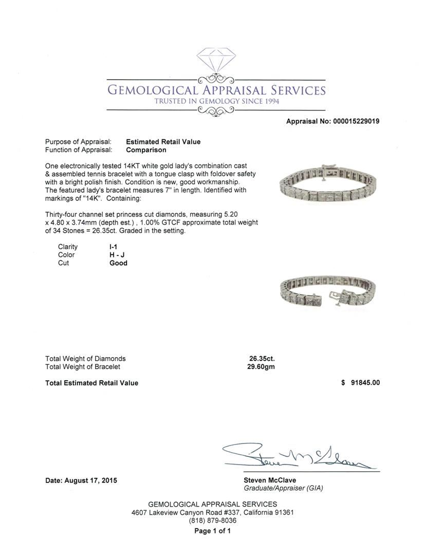 One electronically tested 14KT white gold lady's combination cast & assembled tennis bracelet with a tongue clasp with fold over safety with a bright polish finish. The featured lady's bracelet measures 7" in length. Identified with markings of "14K". Condition is new, good workmanship. Containing: Thirty-Four channel set princess cut diamonds, measuring 5.20 x 4.80 x 3.74mm (depth est.) , 1.00.% GTCF approximate total weight of 34 Stones = 26.35ct. Graded in the setting. Clarity: I-1. Color: H - Good. Total Weight of Diamonds 26.35ct. Total Weight of Bracelet 29.60gm. GAS Appraised at $91,845.00.