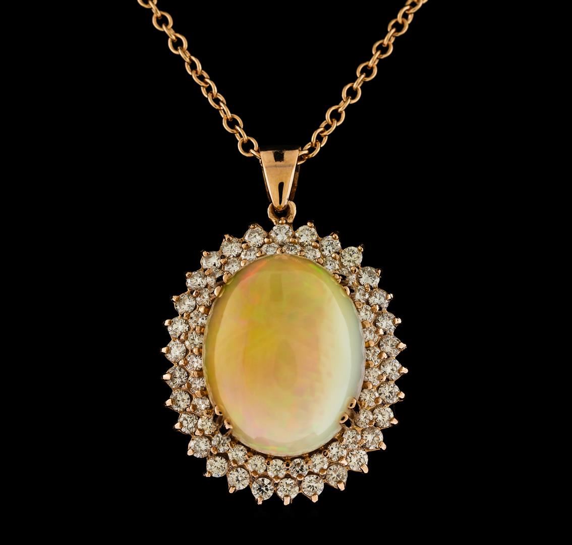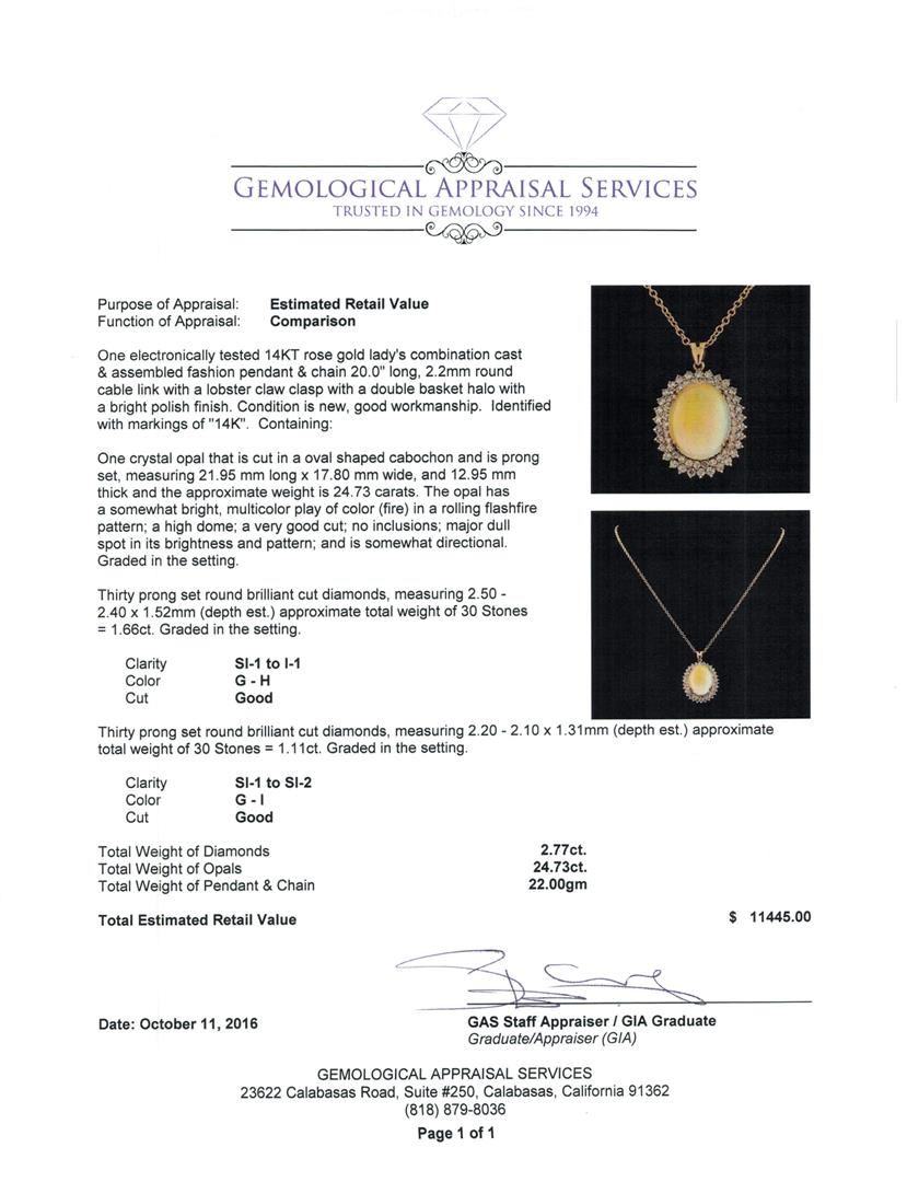 One electronically tested 14KT rose gold lady's combination cast & assembled fashion pendant & chain 20.0' long, 2.2mm round cable link with a lobster claw clasp with a double basket halo with a bright polish finish. Identified with markings of '14K'. Condition is new, good workmanship. Containing: One crystal opal that is cut in a oval shaped cabochon and is prong set, measuring 21.95 mm long x 17.80 mm wide, and 12.95 mm thick and the approximate weight is 24.73 carats. The opal has a somewhat bright, multicolor play of color (fire) in a rolling flashfire pattern; a high dome; a very good cut; no inclusions; major dull spot in its brightness and pattern; and is somewhat directional. Graded in the setting. Thirty prong set round brilliant cut diamonds, measuring 2.50 - 2.40 x 1.52mm (depth est.) approximate total weight of 30 Stones = 1.66ct. Graded in the setting. Clarity SI-1 to I-1. Color: G - H Cut Good Thirty prong set round brilliant cut diamonds, measuring 2.20 - 2.10 x 1.31mm (depth est.) approximate total weight of 30 Stones = 1.11ct. Graded in the setting. Clarity SI-1 to SI-2. Color: G - I Cut Good. Total Weight of Diamonds 2.77ct.. Total Weight of Opals 24.73ct.. Total Weight of Pendant & Chain 22.00gm. GAS Appraised at $11,445.00.