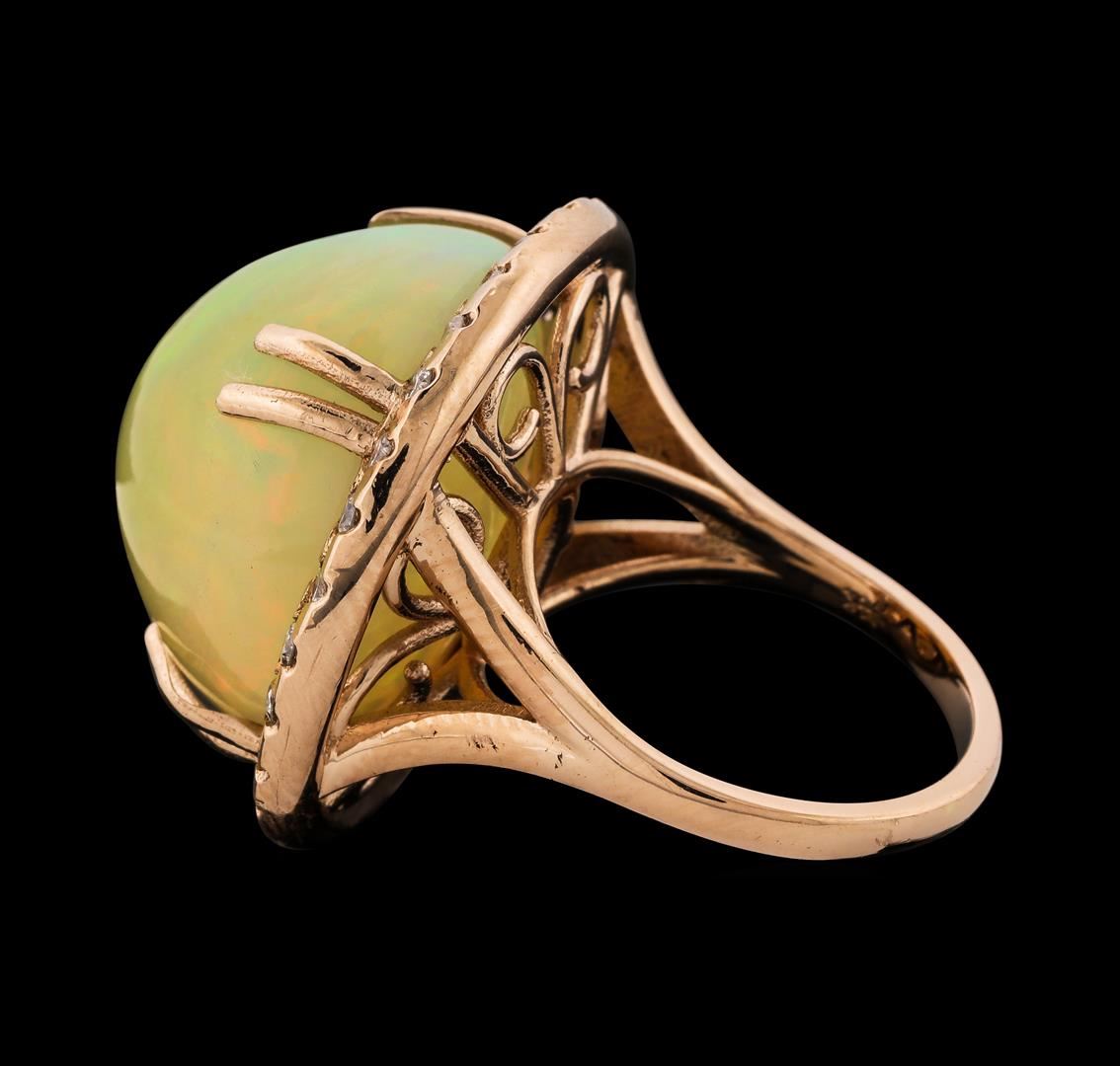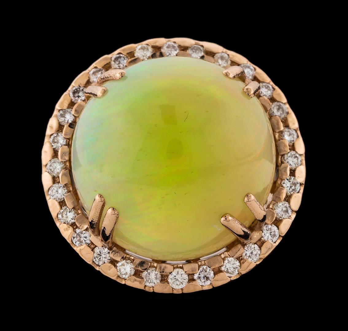 One electronically tested 14KT rose gold lady's cast fashion ring with a split shank halo with a bright polish finish. The featured lady's ring has a shank measuring 2.15 millimeters wide. Identified with markings of 'K14'. Condition is new, good workmanship. Containing: One orange crystal that is cut in a round shaped cabochon and is prong set, measuring 20.00 mm long x 19.75 mm wide, and 15.45 mm thick and the approximate weight is 26.40 carats. The opal has a somewhat bright, multicolor play of color (fire) in a rolling flashfire pattern; a high dome; a good cut; no inclusions; minor dull spot in its brightness and pattern; and is not directional. Graded in the setting. Twenty-Eight prong set round brilliant cut diamonds, measuring 2.00 - 1.90 x 1.21mm (depth est.) approximate total weight of 28 Stones = 0.78ct. Graded in the setting. Clarity SI-1 to SI-2. Color: G - H Cut Good. Total Weight of Diamonds 0.78ct.. Total Weight of Opals 26.40ct.. Total Weight of Ring 15.40gm. GAS Appraised at $11,045.00.