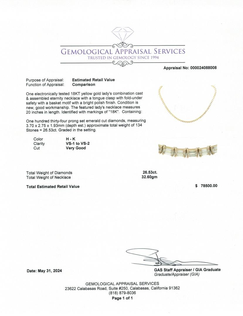 A true showstopper, this 18KT yellow gold eternity necklace offers both luxury and impact. Spanning 20 inches, it boasts 134 prong-set emerald cut diamonds totaling an impressive 26.53 carats, with clarity ranging from VS-1 to VS-2 and color from H to K. With a bright polished finish, fold-under safety, and exquisite craftsmanship, this necklace is a must-have for any high-end collection.