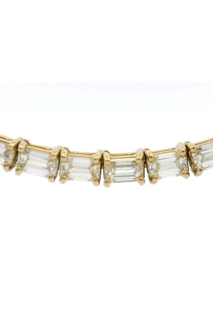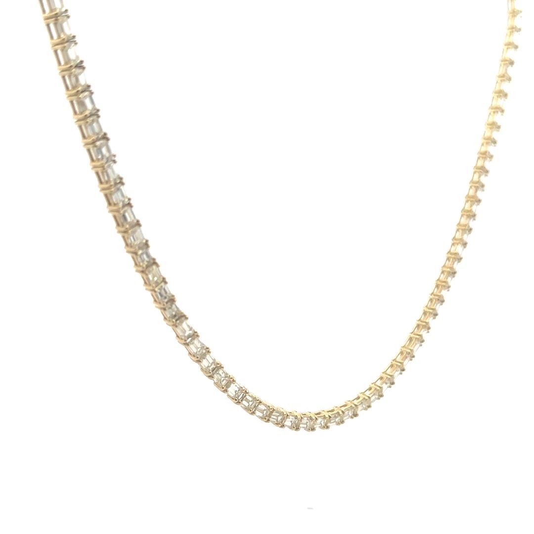 A true showstopper, this 18KT yellow gold eternity necklace offers both luxury and impact. Spanning 20 inches, it boasts 134 prong-set emerald cut diamonds totaling an impressive 26.53 carats, with clarity ranging from VS-1 to VS-2 and color from H to K. With a bright polished finish, fold-under safety, and exquisite craftsmanship, this necklace is a must-have for any high-end collection.