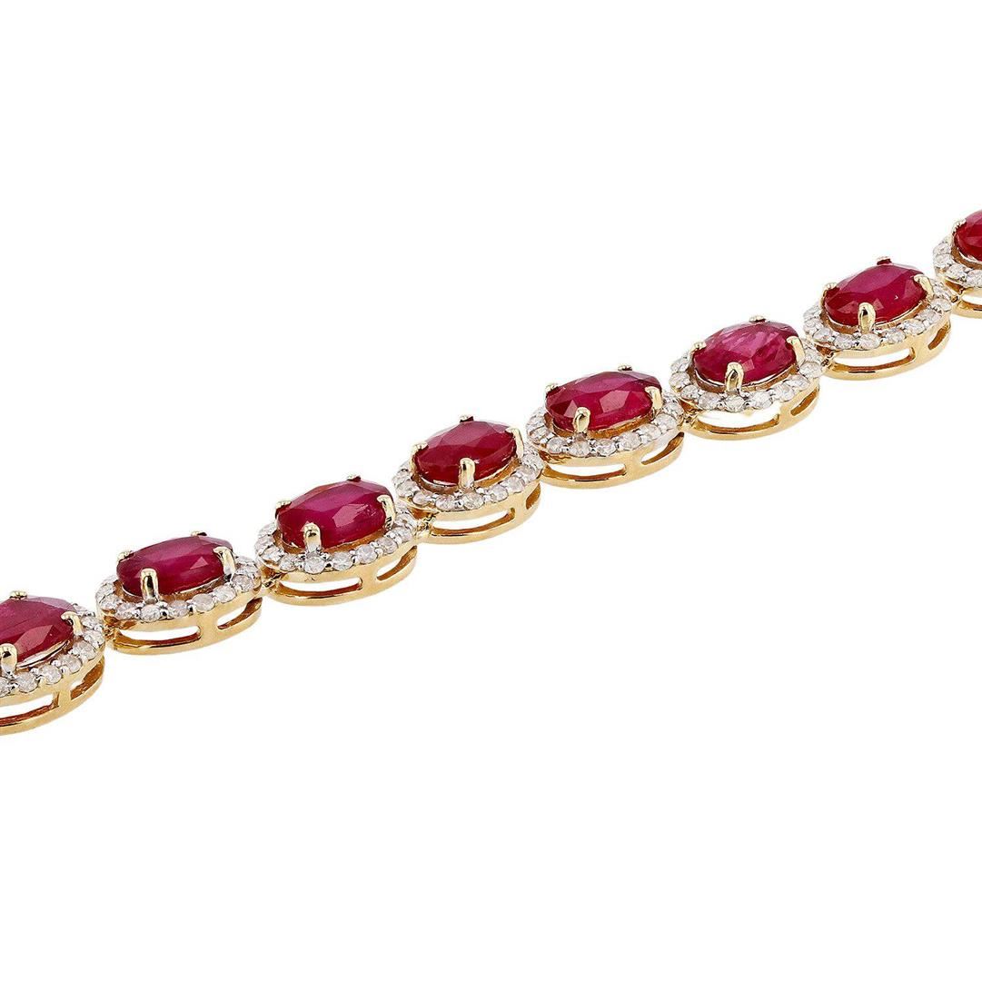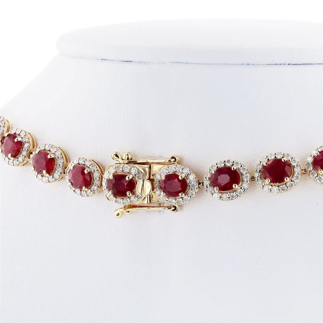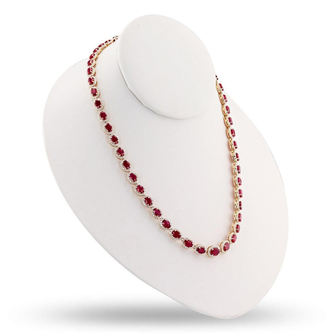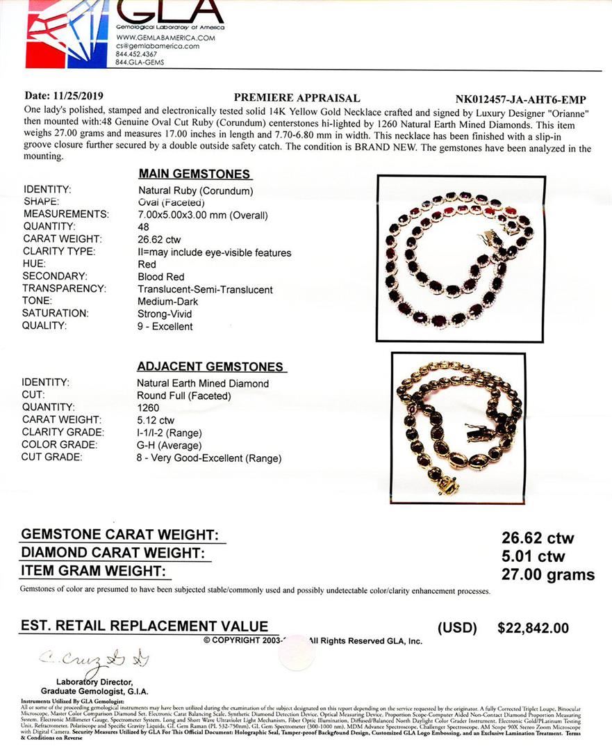 One lady's polished, stamped and electronically tested solid 14K Yellow Gold Necklace crafted and signed by Luxury Designer "Orianne" then mounted with:48 Genuine Oval Cut Ruby (Corundum) centerstones hi-lighted by 1260 Natural Earth Mined Diamonds. This item weighs 27.00 grams and measures 17.00 inches in length and 7.70-6.80 mm in width. This necklace has been finished with a slip-in groove closure further secured by a double outside safety catch. The condition is BRAND NEW. The gemstones have been analyzed in the mounting. MAIN GEMSTONES IDENTITY: Natural Ruby (Corundum) SHAPE: Oval (Faceted) MEASUREMENTS: 7.00x5.00x3.00mm (Overall) QUANTITY: 48 CARAT WEIGHT: 26.62 ctw CLARITY TYPE: II=may include eye-visible features HUE: Red SECONDARY: Blood Red TRANSPARENCY: Translucent-Semi-Translucent TONE: Medium-Dark SATURATION: Strong-Vivid QUALITY: 9 - Excellent ADJACENT GEMSTONES IDENTITY: Natural Earth Mined Diamond CUT: Round Full (Faceted) QUANTITY: 1260 CARAT WEIGHT: 5.12 ctw CLARITY GRADE: I1 to I2 (Range) COLOR GRADE: G - H (Average) CUT GRADE: 8 - Very Good-Excellent (Range) GEMSTONE CARAT WEIGHT: 26.62 ctw DIAMOND CARAT WEIGHT: 5.01 ctw ITEM GRAM WEIGHT: 27.00 grams