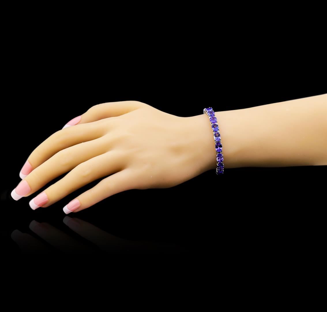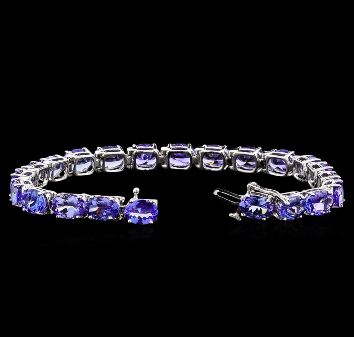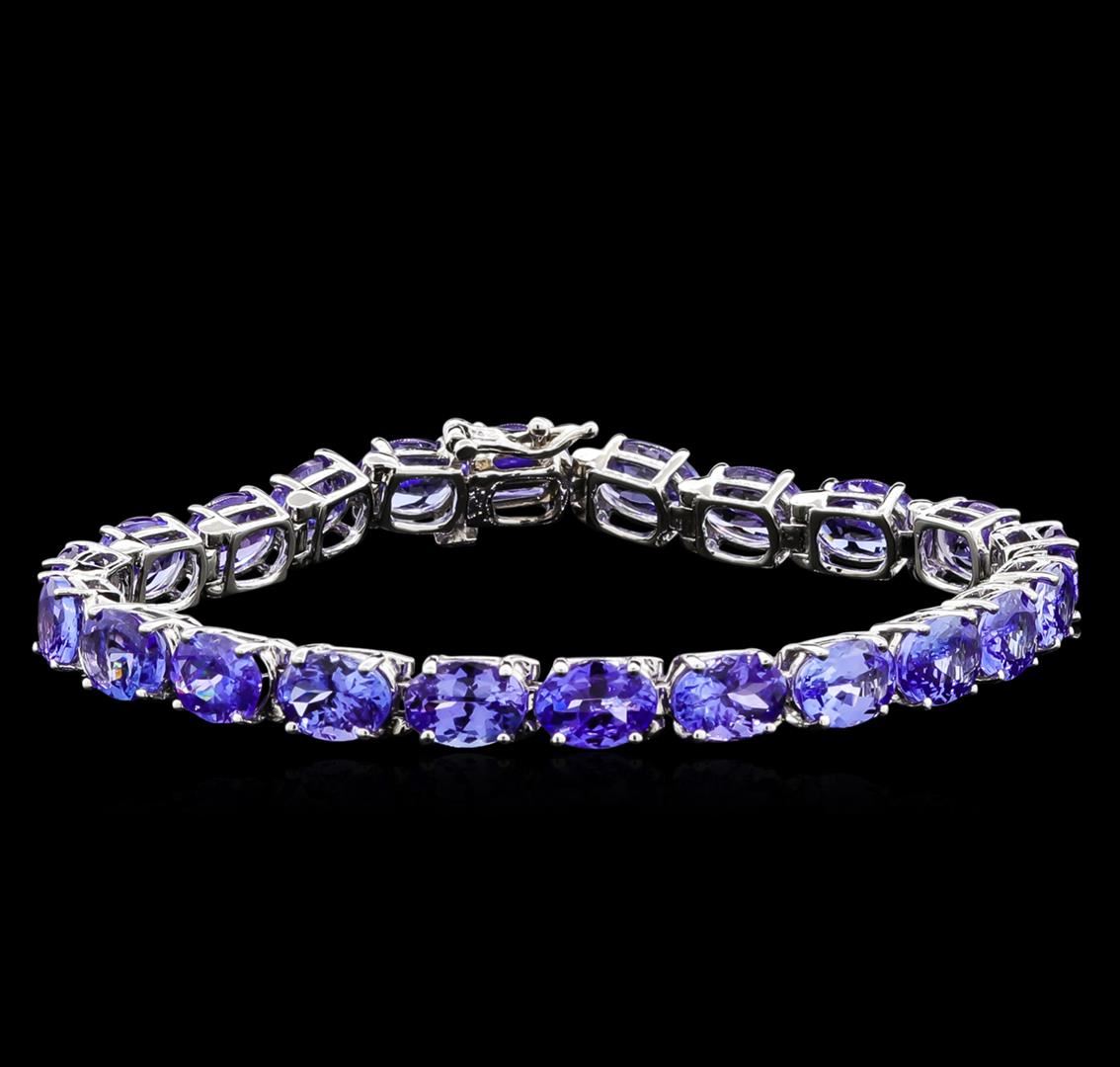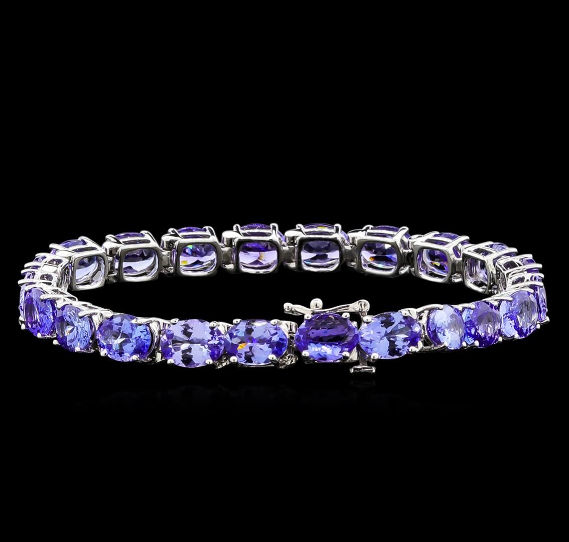 One electronically tested 14KT white gold lady's combination cast & assembled fashion bracelet with a tongue clasp with foldover safety with a bright polish finish. The featured lady's bracelet measures approximately 7 inches in length. Identified with markings of "14K". Condition is new, good workmanship. Containing: Twenty-two prong set oval modified brilliant cut natural tanzanites, measuring 7.90 x 6.00 x 3.63mm, approximate total weight of 26.68ct., clarity is eye clean, type I, medium, very slightly grayish, violetish blue color, (GIA vB 5/3), cut is good. Transmitting light with no distortion, transparent. Colored gemstones are presumed to have been subjected to commonly used enhancement processes. Graded in the setting. Total Weight of Colored Stones 26.68ct. Total Weight of Bracelet 17.20gm. GAS Appraised at $19,995.00.