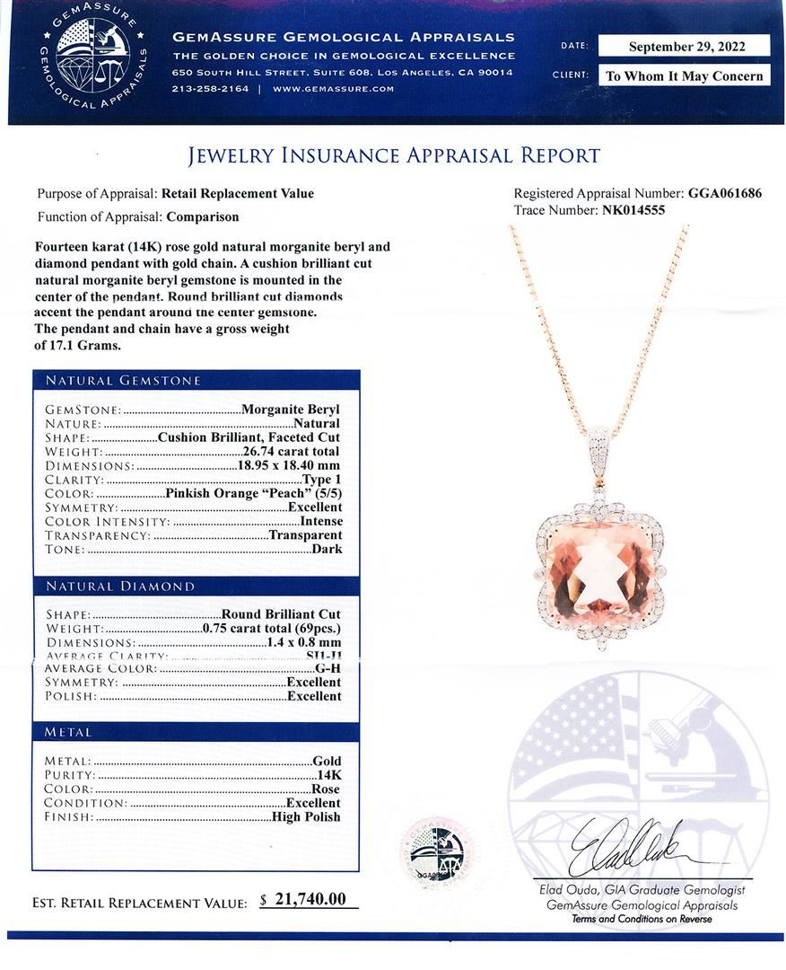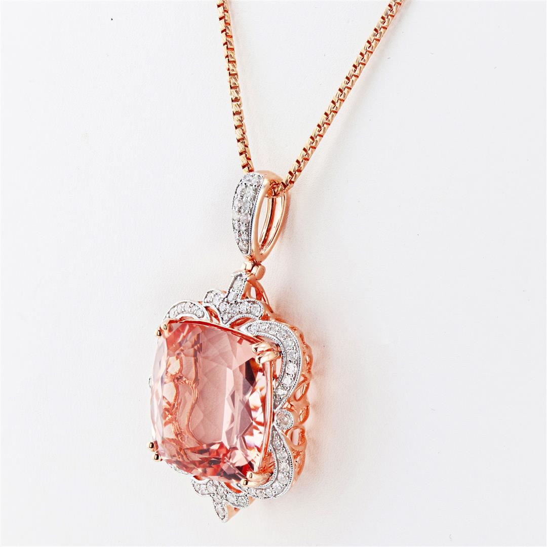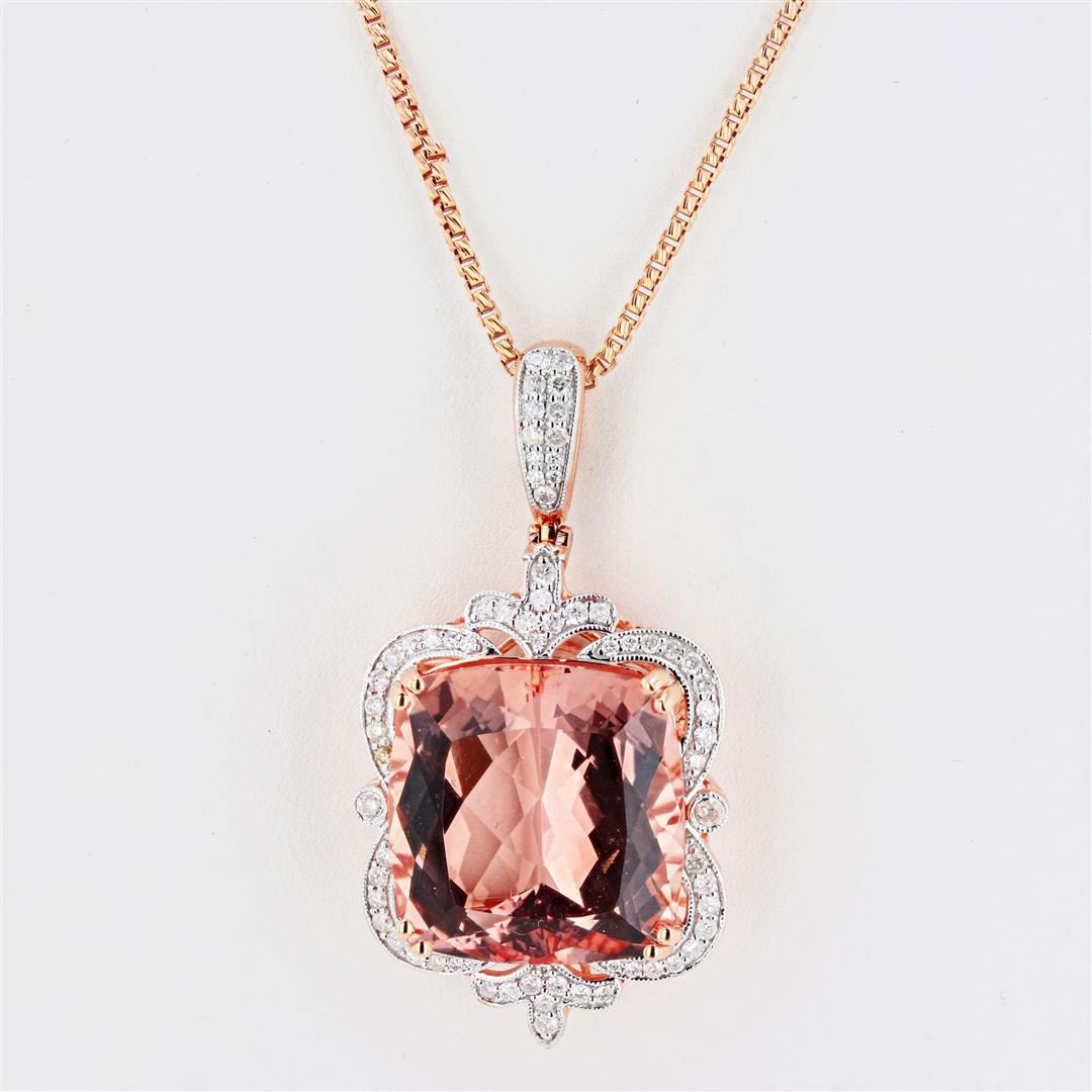 Fourteen karat (14K) rose gold natural morganite beryl and diamond pendant with gold chain. A cushion brilliant cut natural morganite beryl gemstone is mounted in the center of the pendant. Round brilliant cut diamonds accent the pendant around tne center