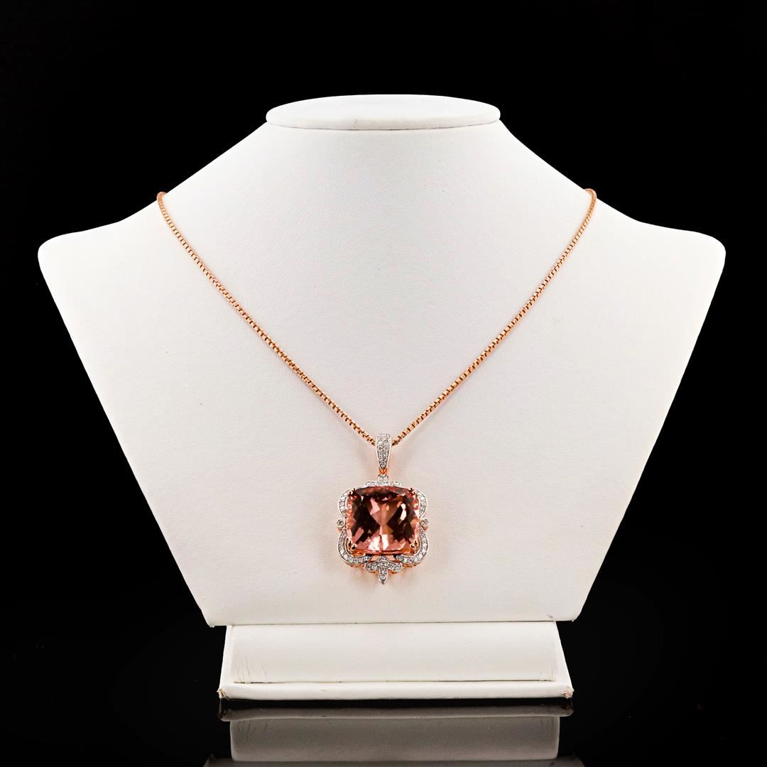 Fourteen karat (14K) rose gold natural morganite beryl and diamond pendant with gold chain. A cushion brilliant cut natural morganite beryl gemstone is mounted in the center of the pendant. Round brilliant cut diamonds accent the pendant around tne center